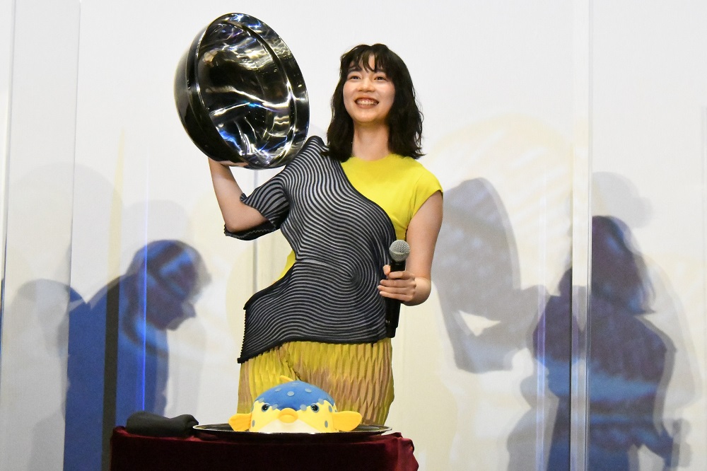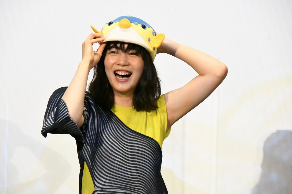 それぞれの好みが明かされ盛り上がるなか、ここでさかなクンからのんへプレゼント! 運ばれてきたワゴンに乗せられた銀の蓋を開けると、さかなクンの代名詞でありチャームポイントのハコフグ帽が! さかなクンのハコフグは角ばっているものの、今回のんへプレゼントされたハコフグは丸みを帯びたかわいらしいスタイルをチョイスしたそうで、その場で実際にのんが被るとその似合いっぷりに観客、キャストからは拍手が起こり、「かわいい~~! うれしい! ありがとうございます! ギョギョー!」とさかなクンからの“ハコフグ帽贈呈”に大喜び。