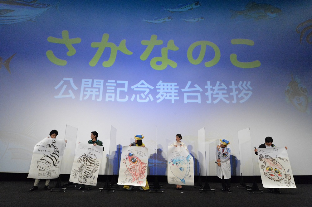さらに、さかなクンからは本日の登壇者全員へもうひとつサプライズ! 驚く一同の前に登場したのは、登壇者一同をそれぞれイメージして描かれた、さかなクン直筆の可愛らしいおさかなイラスト。この日に登壇するキャスト陣と監督のために描いたようで、のん演じるミー坊は目がとってもキラキラしているという理由でイットウダイ、井川演じる母・ミチコは海の中でも色んなお魚を治す力を持ち、大らかなマンボウ、磯村演じる総長はギョじゅっキロ(50kg)という巨大な身体を持つ“磯”の王者クエ、岡山演じるカミソリ籾は大きいお魚を誘導するというブリモドキ、沖田監督は見た目が似ているとずっと思っていたというコロコロして可愛いショウキハゼ、と一人ひとりにぴったりなイラストが贈られた。