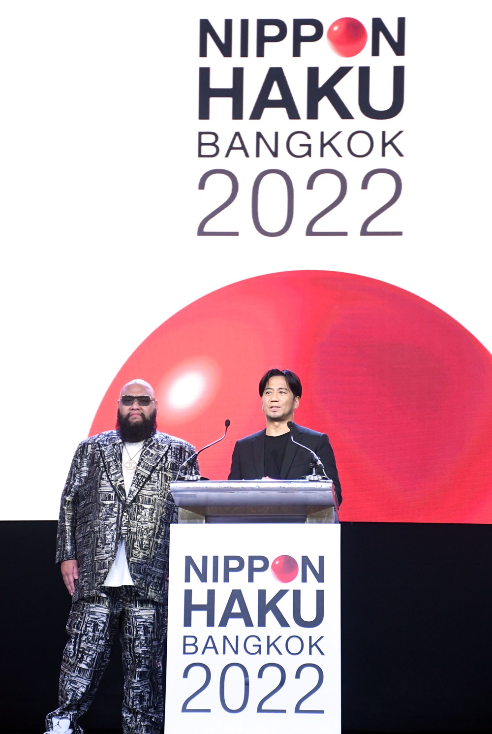 コロナ禍の影響で、2020年は中止、2021年はオンライン開催だったため、3年ぶりのオフライン開催となった今回の『日本博』。熱気に包まれる会場には、梨田和也在タイ日本大使をはじめ、5月に史上最多の得票数で新都知事に当選したチャチャート都知事や、タイ国外務省東アジア局のアジャリー・シラタナボール局長らが駆けつけるなか、梨田大使が「日本とタイが外交関係を結んで135年の記念すべき年に、日本とタイのあらたな架け橋となるプロジェクトがスタートします。ふたつの社のメインパーソンを皆さんに紹介したいと思います」という紹介からHIROとF.HEROが登壇すると、会場から大きな拍手が送られた。