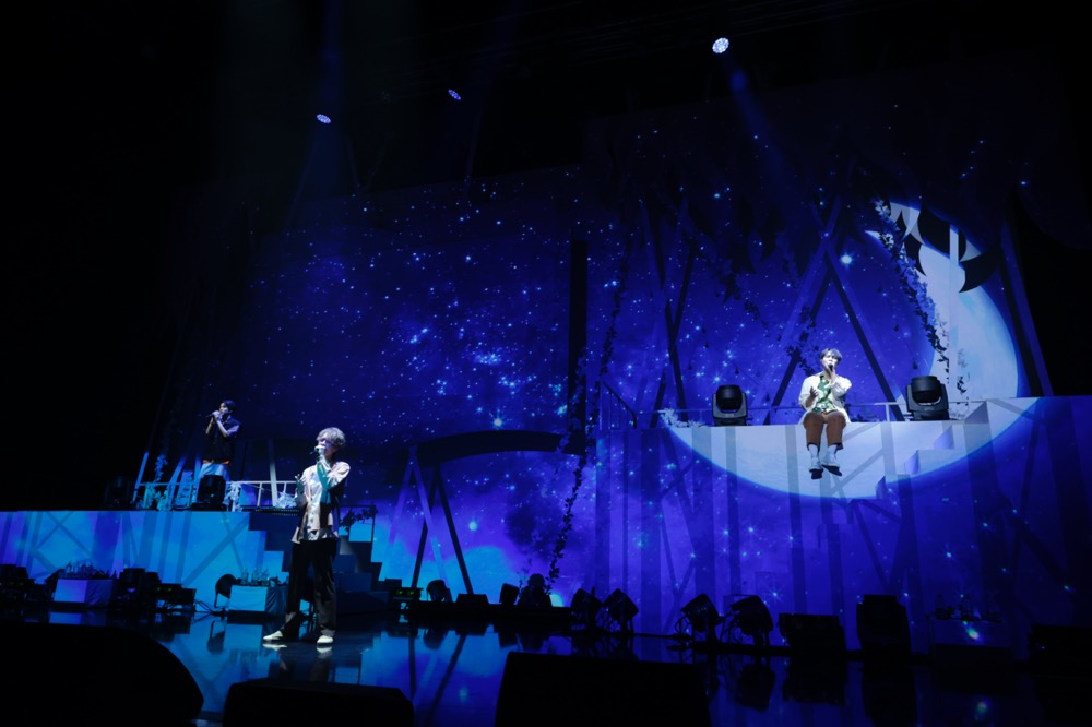 ここで、FUMINORIが「次はゆったりと揺れていってください」と呼びかけ、アーバンR&B「ON & ON」「R4U」へ。メロウなグルーブでフロアのムードをチルアウトさせたところで、ステージはプロジェクションマッピングによって星が降り注ぐ夜空へと変化。三日月に座ってるように見えるKEVINをはじめ、MORRIEとSHOOTの3人のボーカリストのみで、端正なピアノバラードにリミックスされた「ENCHANT」を切なくエモーショナルに歌い上げると、ダンサー7人によるダンストラックでは、カラフルに点滅する光の中で様々な組み合わせとスタイルによる多彩で個性的なダンスパフォーマンスを展開。そのままシームレスにダンスビートが立ち現れ、「To The Top」のリミックスを経て、「BEAST2」では、パワフルで荒々しいダンスに加え、FUMIYAとSEIYAがワイルドでアグレッシヴなラップをみせ、今年8月にリースしたCDシングルのカップリング曲であるフューチャーディスコ「RISE IN LOVE」ではMORRIIEが大人っぽくもジェントリーでセクシーな表情も見せるなど、楽曲ごとに異なる魅力を存分に発揮した。