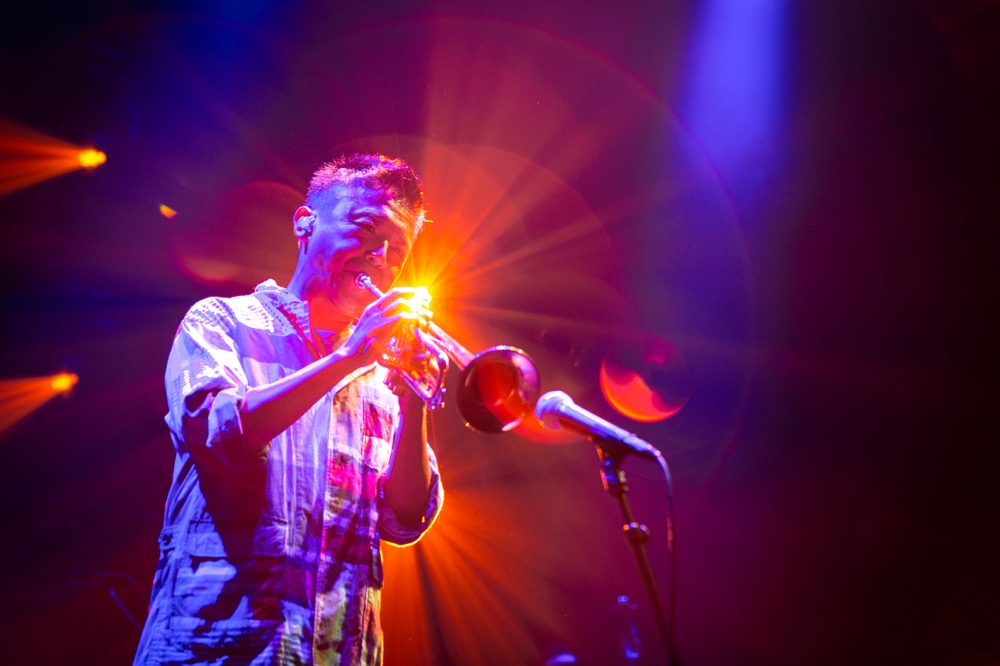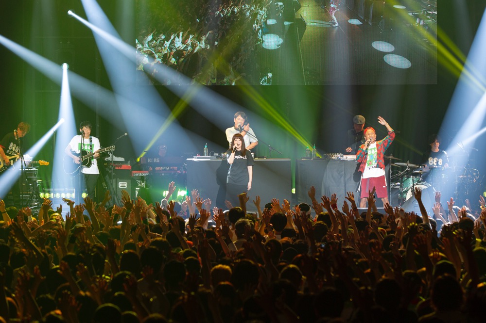 オープニングアクトのDJダイノジが会場を盛り上げたあと、ウカスカジーのライブへ。1曲目は、穏やかで温かいメッセージを込めた「My Home」。GAKU-MCが今年はじめたというトランペットを演奏し、素朴な音色でフロアを穏やかに包み込む。さらに「Anniversary」「We are not afraid」と代表曲を続け、日本全国から集まった観客も楽しそうに体を揺らしていた。