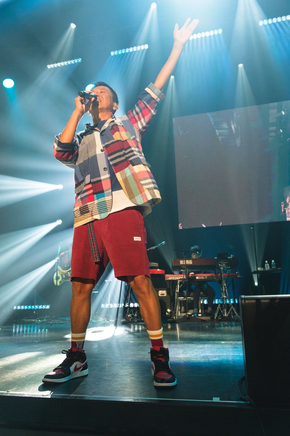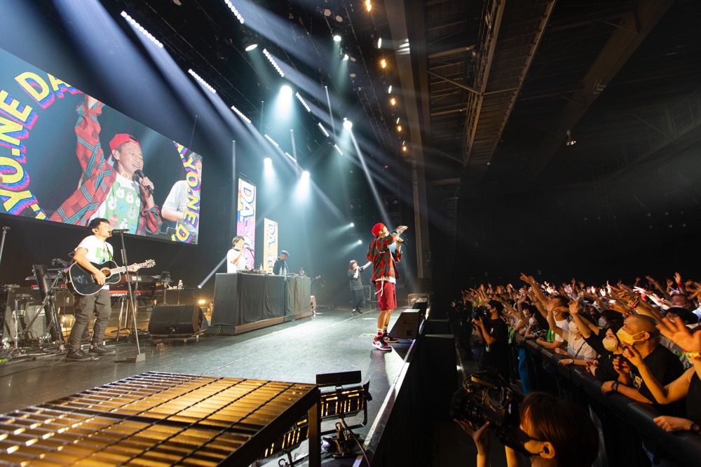 EAST END×YURIとしてのステージは、なんと26年ぶり。披露されたのはもちろん、代表曲「DA.YO.NE」(1994年)「MAICCA~まいっか」(1995年)だ。どちらも日本のヒップホップ史に欠かせない大ヒット曲。90年代前半のレアグルーヴを色濃く反映したサウンド、20代の恋愛をカジュアルに描いたリリック。この2曲のキャッチーな魅力は、27年以上が経った現在もまったく色褪せていない。GAKU-MCとYURIの自然体のパフォーマンス、YOGGYのCDJのスクラッチ、生のバンドサウンド(桜井はアコギとコーラスを担当)も最高。2022年9月20日にデビュー30周年を迎えるGAKU-MCにとっても、記念すべきステージになったはずだ。