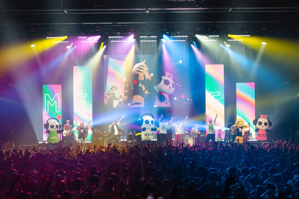 続く「HAPPY HOUR」では、大地洋輔と大谷ノブ彦らDJダイノジのメンバー、MIFAのマスコットキャラクターのミファンダ、ミソラ、レッシも登場し、桜井の開放的な歌声、揃いの振り付けとともにナチュラルな一体感を演出。さらに「手を出すな!」、JFA公認サッカー日本代表応援ソング「勝利の笑みを君と ~日本サッカーのために~」といったアンセムを次々と放ち、心地よい高揚感を生み出した。