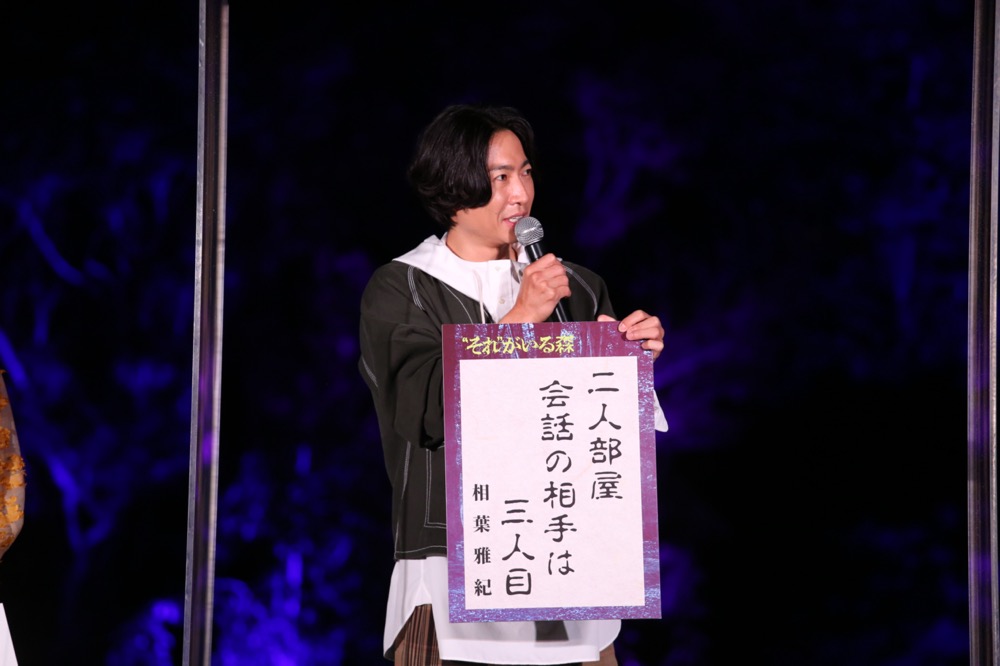 不気味にライトアップされた小雨降る薄暗い森の中に相葉雅紀、松本穂香が登壇。相葉は「今日は足元に悪い中、そしてこんなちょっと嫌な雰囲気のする会場まで来ていただいてありがとうございます!(笑)」と、松本は「こんな真っ暗な森の中でイベントをやらせてもらうことがあまりないので楽しみたいと思います!」と、それぞれ映画の雰囲気にぴったりな不気味な森に触れながら挨拶した。