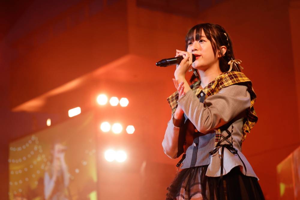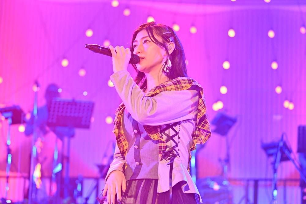 グレーのワンピースやショートパンツをベースにした衣装に、袖や襟には黄色と黒のチェックのフリルが秋らしいポイントとなっており、フレアのレースが上品さを引き立てる可愛らしくスマートな衣装でステージに登場すると、Studio Apartmentのカバー曲「Life from the sun」でライブをスタート。