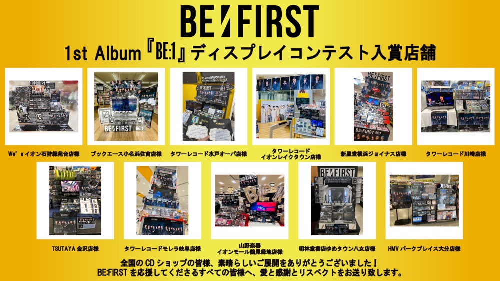 このディスプレイコンテストは、CDの発売時期に関わらず、日頃からBE:FIRSTのCDコーナーを展開し、応援してくれている全国のCDショップの人たちに対し、メンバーの感謝の気持ちを込めて実施。入賞した11店舗には“直筆サイン入り『BE:1』特製フレーム付き映像プレーヤー”が贈呈された。