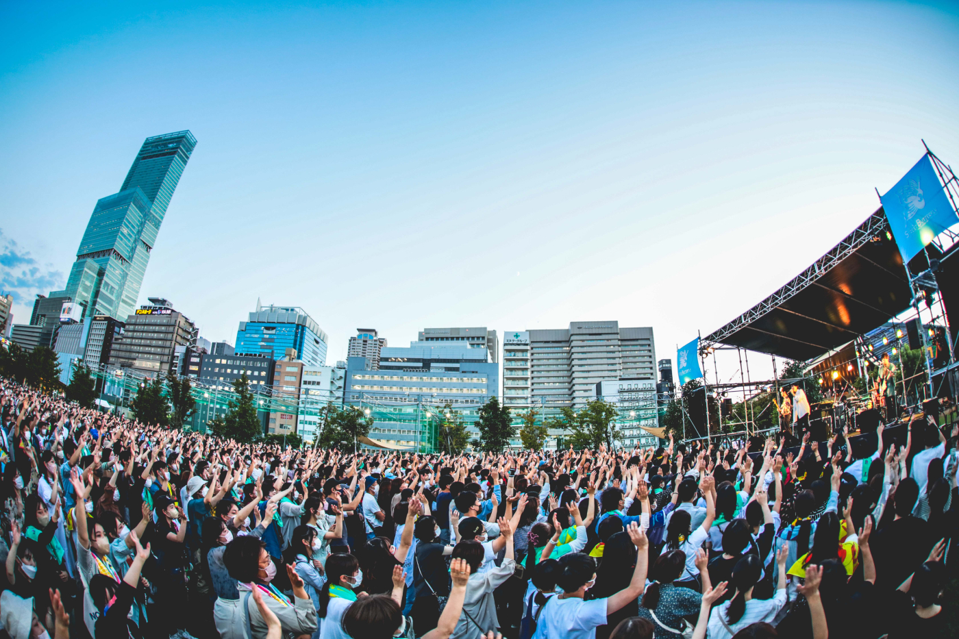 天王寺はflumpoolがデビュー前に路上ライブを行っていた思い出の場所だ。この日は、天王寺公園内のエントランスエリア てんしば特設ステージに登場。早くから続々と人が集まり、ステージ前から後方まで、約3000人の観客で埋まっていた。