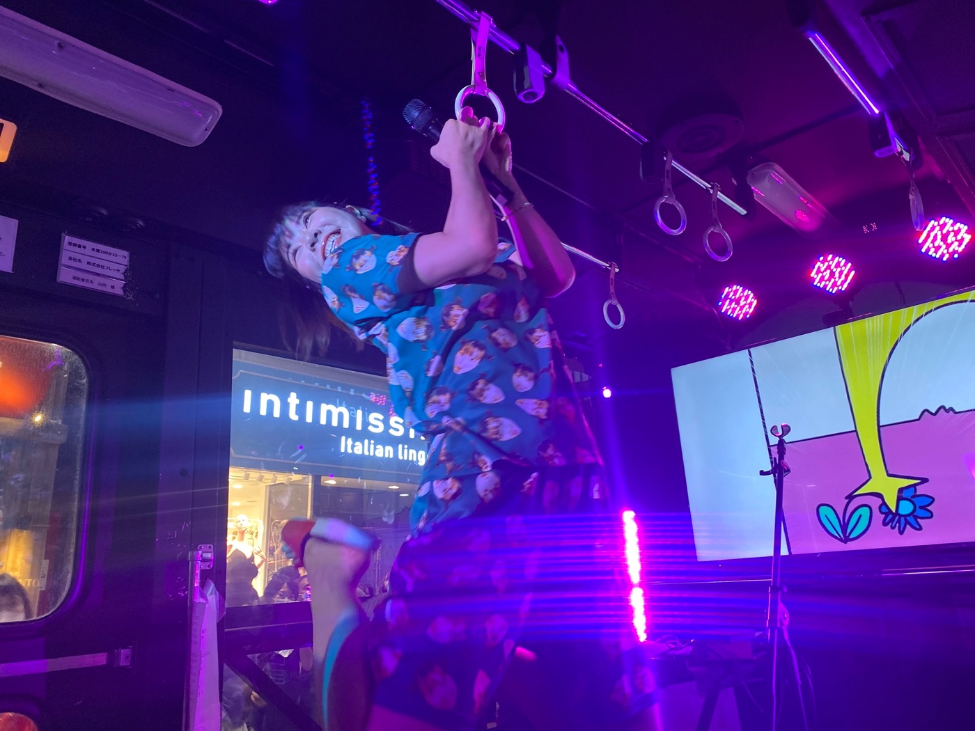 バスが走るコースは基本的には渋谷駅周辺だったが、前半では表参道や青山にも移動。歩いている犬も何処となく上流階級の気品を漂わせる港区に入っても気圧されることなく、「ほめられてる!」「顔面ファラウェイ」などを歌って自分の世界に染めていったちちゃん。「我々のエキスで港区を侵食してやりましょう!」と、みんなの気持ちも鼓舞してくれた。走るバスの車内は当然ながら揺れるが、吊革もパフォーマンスの道具にしながら歌い、時にはアコースティックギターも手にして奏でる姿が雄々しい。