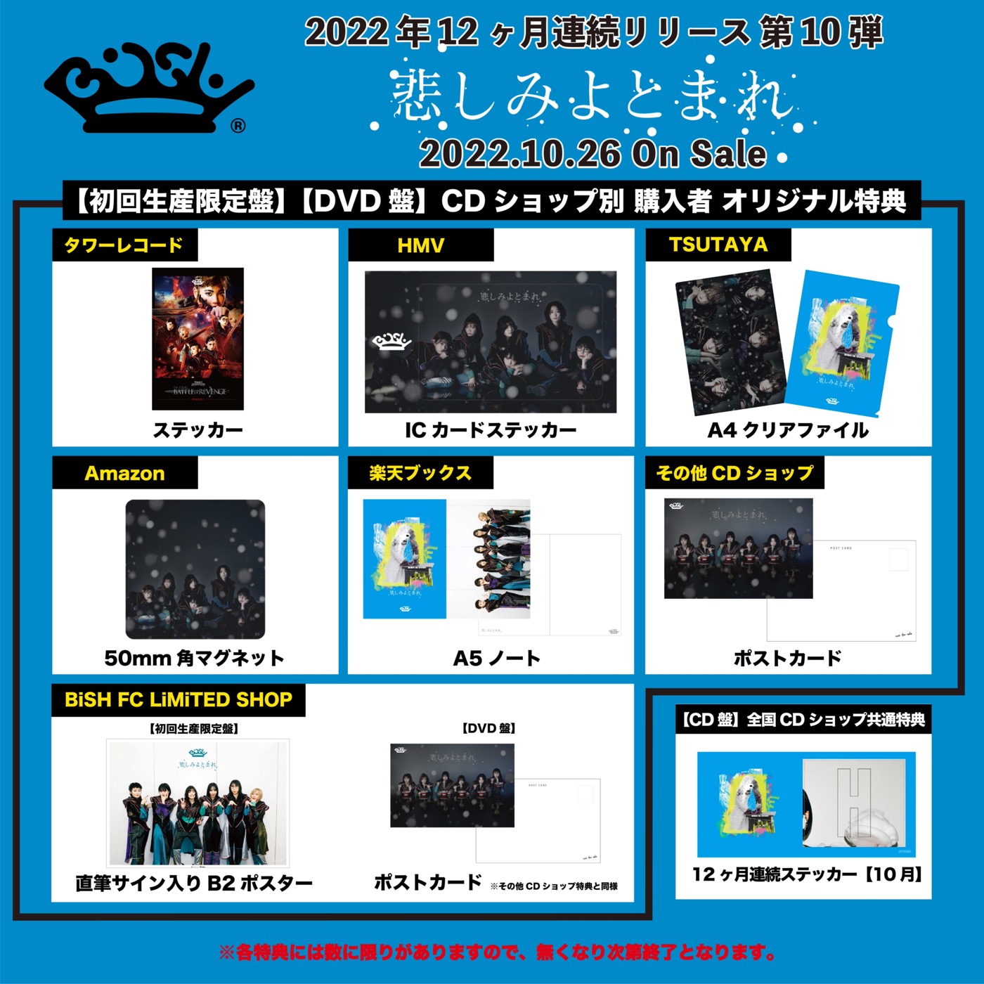 12ヵ月連続リリース第10弾「悲しみよとまれ」の店舗別特典も公開。こちらは各店舗でのCDの[初回盤][DVD盤]購入者が先着で手に入れることができる特典となっている。BiSH FC LiMiTED SHOPでは、メンバー全員の直筆サイン入りポスターが付く。