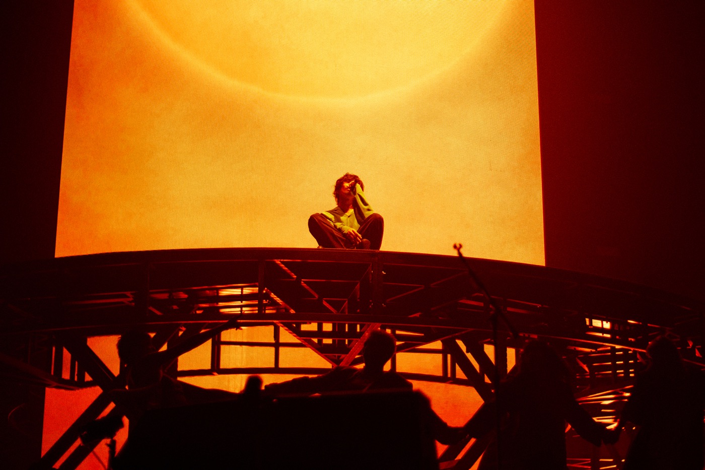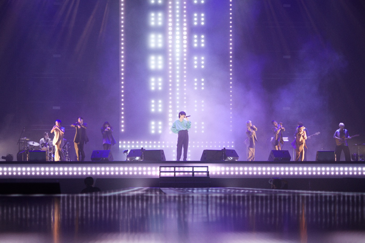 米津とバンドメンバーの中島宏士(Gu)、須藤優(Ba)、堀正輝(Dr)がステージ上に立ち並ぶ形で展開したライブ中盤には「アイネクライネ」「Pale Blue」と珠玉のラブソングが続けて披露され、瑞々しいボーカルとバンドサウンドが観る者の心を揺さぶる。そして「パプリカ」では、ゆっくりと上昇してゆく円形ステージに腰かけ、美しい揺らぎのあるボーカルを響かせた米津。彼の歌声に呼び寄せられるように姿を見せたダンサーたちは無邪気にステージ上を駆け回り、茜色に照らされた空間には無数の紙吹雪がゆったりと宙を舞った。