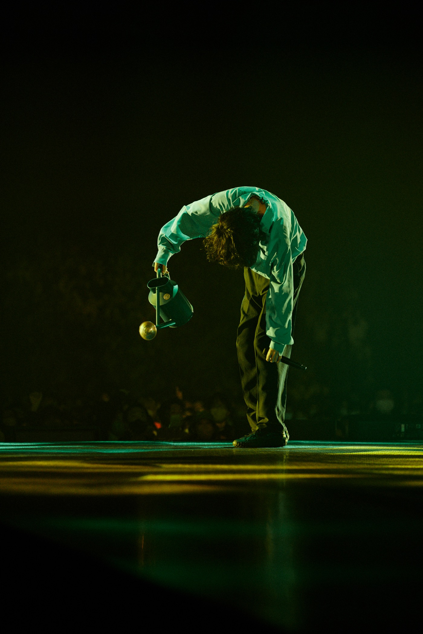 客電が落ち、ステージ両脇のスクリーンに映し出されたのは地下駐車場の風景。車で乗り付けたのは米津のオリジナルキャラクター“NIGI chan”で、彼はトランクから取り出したジョウロを手に、エレベーターへと乗り込んだ。ステージ中央で存在感を放つ縦型の巨大LEDビジョンの中で“エレベーター”の扉が開くと、そこにはジョウロを片手に持った米津の姿が。歓喜の拍手に包まれた彼が1曲目に届けたのは「POP SONG」。「変身」をキーワードのひとつとして制作され、MVの中で自身も大きな“変身”を遂げたこの曲でライブの幕を開けた米津は、花道に設置されたベルトコンベアで優雅な移動を見せて観客の驚きを誘う。遊び心溢れる演出で冒頭からファンの心をぐっと掴んだ米津は「埼玉ー!」と声を上げ、さらなる熱狂を作り上げた。