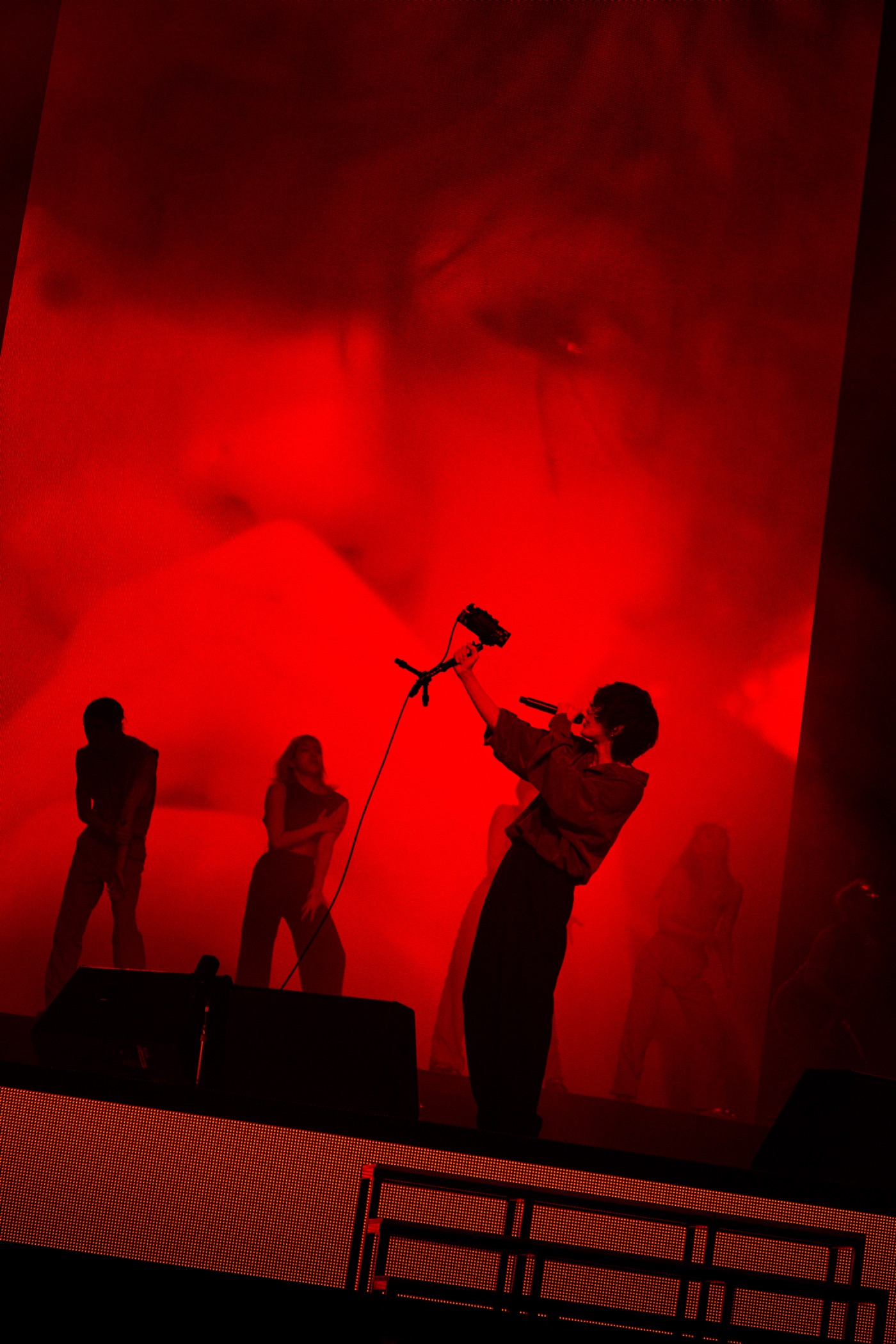 続くセクションでも広大な空間をダイナミックに使う演出を駆使しながら、美しいステージングを披露してゆく米津。彼の圧倒的な歌唱と辻本知彦の雄弁な身体表現が観客の目を奪った「迷える羊」ののち、「カナリヤ」では無数の光の線がステージ上に鳥かごを思わせる造形を作り上げる。その中にひとり立ち、カナリヤイエローのスポットライトに静かに照らされた米津は、感情の機微を歌に乗せる豊かなパフォーマンスでオーディエンスを惹き付けた。また、「海の幽霊」では深いブルーの光のうねりによってアリーナ空間が広大な海へと姿を変える。ダイナミックな演出と荘厳なサウンドの中心に立つ米津は、スタンドから外したマイクを左手に強く握りしめながら歌に力を込めた。