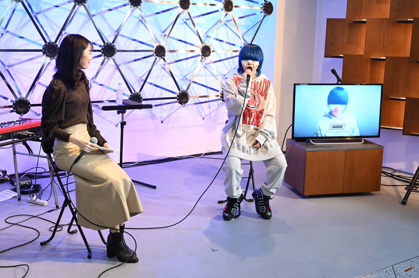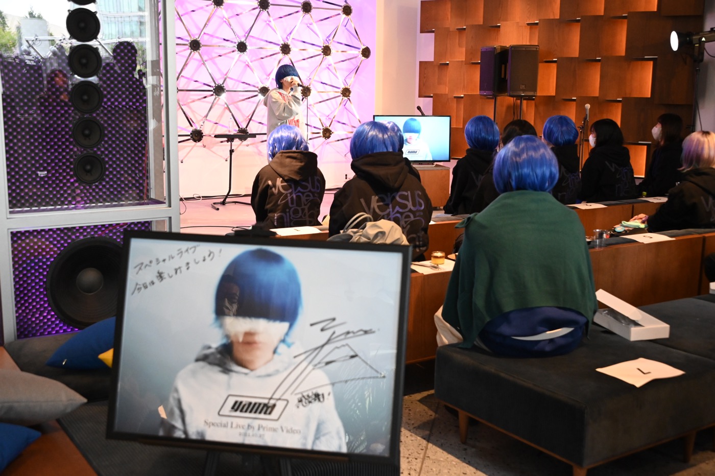 本日のライブは、一足早いハロウィンパーティーとして、SNSのPrime Video公式アカウントから参加者の募集および選考が行われ、yamaへの熱い思いをツイートした方たちの中から選ばれた13組21人のファンに向けて開催された。招待されたファンは会場で青い髪とパーカーに着替えてライブに参加。当選した13組21人のために、yamaは、ツアーにも同行しているキーボ ーディストの和久井沙良とアコースティック編成で、大人気TVアニメ『SPY×FAMILY』第2クール エンディング主題歌「色彩」を含む6曲を披露した。