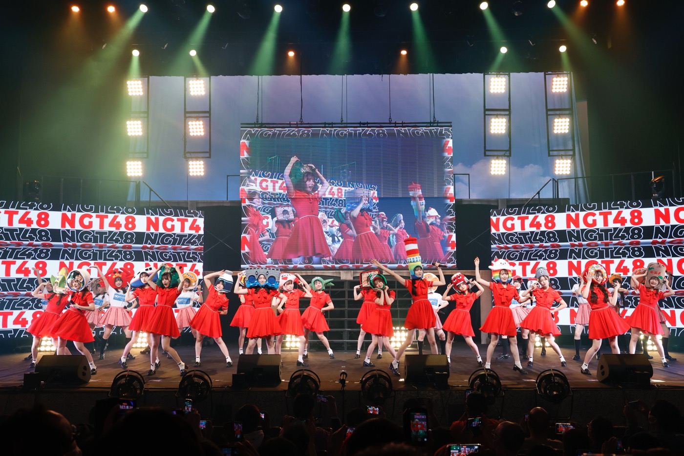 アンコール明けには、西潟茉莉奈の配信で名物となっている被り物をメンバーみんなが被って登場。萬代橋、佐渡金山、Maxとき(新幹線)、おむすび、タレカツ、レインボータワー、ばんにゃいくんなど、新潟の名所・名物・ご当地キャラの被り物姿で「NGT48」をパフォーマンスし、最後まで新潟色に染まったステージとなった。