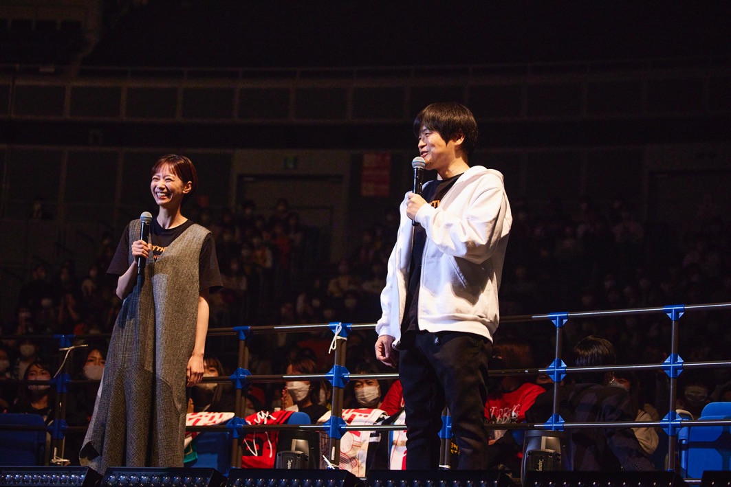 『バズリズム LIVE』は日本テレビ系列の番組『バズリズム02』が発信する音楽イベントとして2015年にスタート。今回で8回目を迎える。前日のDay1は様々なジャンルのアーティストが結集したが、2日目のDay2はバンド系。石川みなみ(日本テレビアナウンサー)と共にステージに現れたMCのバカリズムは、場内を見回し「昨日はペンライトが多かったけど、今日は己の肉体だけでぶつかっていくぜ! みたいなお客さんが多いですね」と2日間のお客さんの違いを分析。2020年、2021年は新型ウイルス感染症拡大を受け人数制限の中での開催を余儀なくされたが、今年は晴れて収容人数の規制が全面解除(マスク着用、声出し禁止は引き続き)され、2日間満員の2万2,000人を動員。久し振りの満席の会場を見てバカリズムも感無量気味で、Day2の開始を宣言した。