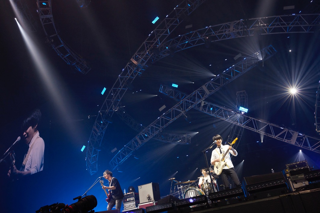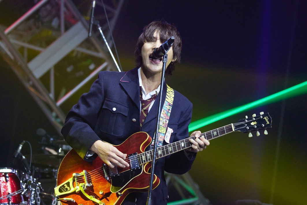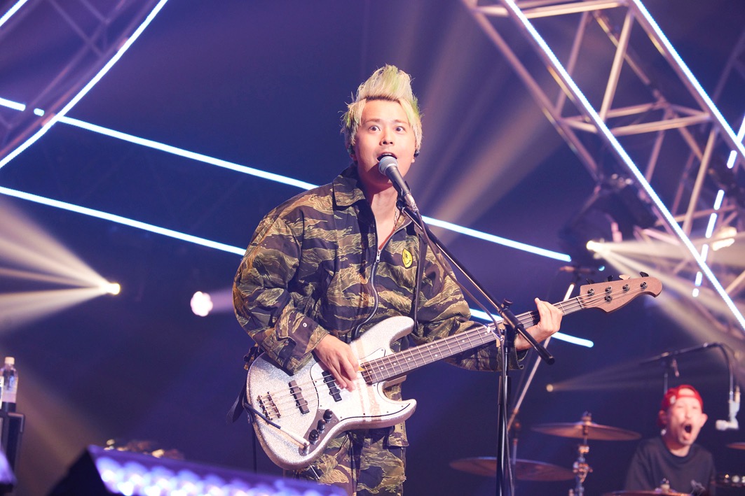3組目は昨年に続いて2度目の参加となるTHE ORAL CIGARETTES。バンド登場のアナウンスが流れるや、場内は大いに沸く。「2回目です!よろしく!」とシャウトし「GET BACK」「5150」を挨拶代わりにと超爆音で叩き込む。トラック・スーツ姿の自身を見直し、山中拓也(Vo)は開口一番「ボク、白シャツにネクタイじゃないんですけど……。バズリズムにドレスコードあったっけ? スカパラさんもスーツやろうし」とぼやく。そういえばUNISON SQUARE GARDENも、go!go!vanillasもボーカルはネクタイ着用だった。ベースのあきらかにあきらから「大丈夫やて、SUPER BEAVERは絶対ネクタイ違ゃうよ」と慰められる始末。気を取り直して「最初から飛び跳ねてちょうだい!」と3曲目の「ENEMY」に突入。オーディエンス全員がその場でジャンプし、場内のエネルギーはマックス状態に。その勢いのまま、後半も絶好調で走りに走る。5曲目の「カンタンナコト」ではメンバーに合わせて全員がヘドバン。声こそ出せないが、これでオーディエンスもバンドと一体化。横浜アリーナの客席全体がヘドバンで揺れる光景は壮観だ。ラストの「狂乱Hey Kids!!」では、レーザービームが激しく行き交い、場内は混沌とした世界に転じる。「小さいライブハウスでも、大きい会場でも愛の強さというもんは一緒なので、あなたが行きたいライブに行ってまた遊びに来てください!」と呼びかけ、ステージを降りた。