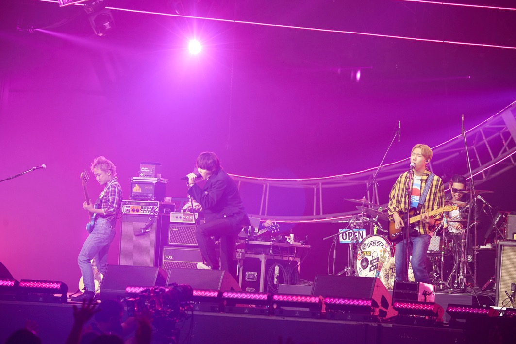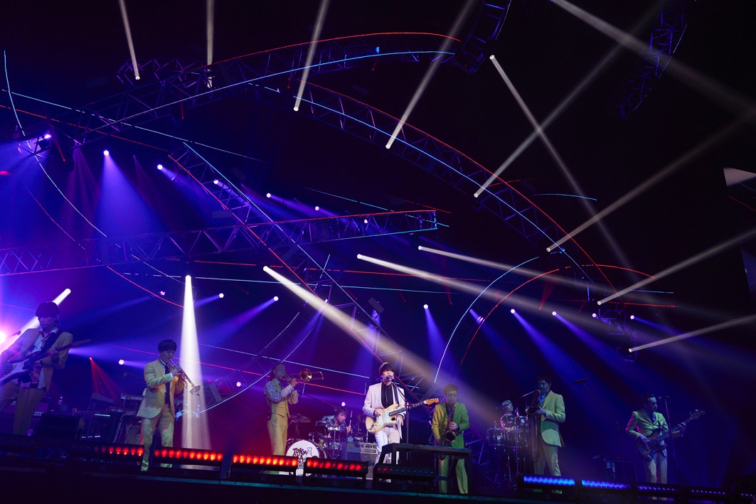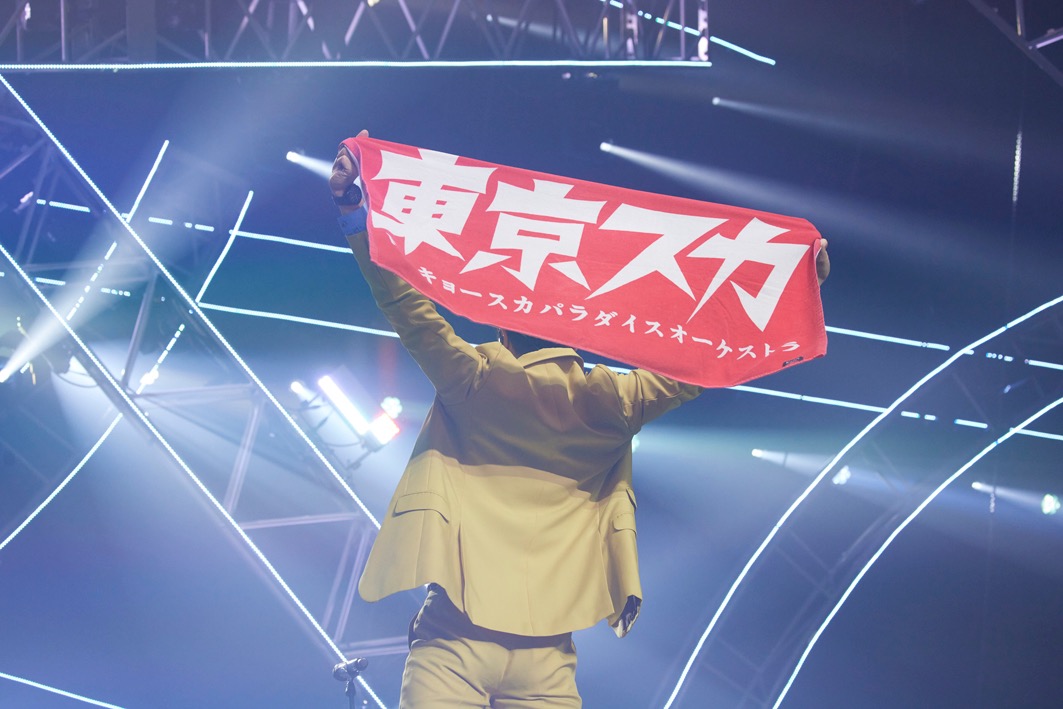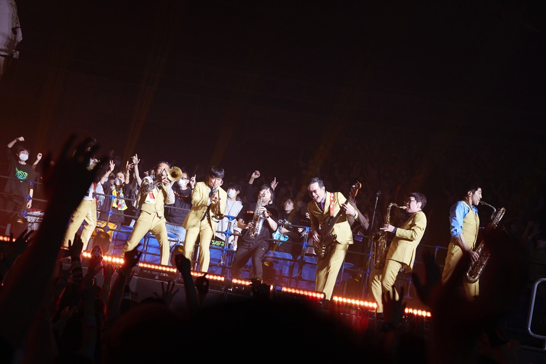 「スカパラ先輩がバカリズムさん呼んで、フィナーレみたいなライブしちゃったもんだから、俺たちどんな顔して出ればええのかなと思ってましたが、あなた方を見たら安心しました」とオーディエンスの熱い反応にひと安堵。3曲目の「美しい日」の冒頭、渋谷龍太はマイクなしの生声で歌唱。オーディエンスもこの意気に手を打って応じる。広い会場に生の歌とクラッピングの音が響き渡る様はちょっと感動的な光景だ。
