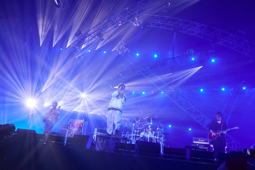 Day2最初に登場は第1回(2015年)、2018年に続く3回目の出演となるUNISON SQUARE GARDENの3人。鈴木貴雄のドラムが激しく一閃すると、ギターとベースが一気に叩き込まれる。ここからは曲間ほとんどなしのノンストップでバンドは爆走する。歌詞がマシンガンのように飛び出す斎藤宏介のボーカルに合わせ、ドラムもベースも超高速で併走。このスピーディな演奏は3人の卓越した技術があってこそ。特に斎藤宏介の音域の広さは圧巻。低音から高音まで縦横無尽に歌いきる。しかもその声は限りなく透明で美しい。ラストの「kaleido proud fiesta」では攻めた演奏はそのまま、メロディはポップとアンバランスなのに秩序がある楽曲だ。全7曲をほぼノンストップで疾走、MCも一切なし。トップバッターとはかくあるべし!という姿勢を見せつけた。バックステージに降りる手前で、斎藤宏介は客席に向き直り、オフマイクで「ア・リ・ガ・ト・ウ!」とお礼をしていた。