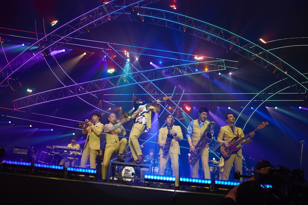 「本日参加したバンドの中で最年長です」と照れながら話す茂木欣一(Dr)は、「みんなの未来の幸せを祈って歌いたいと思います」と「君にサチアレ」でリードボーカルをとる。バカリズムが脚本を手がけ今年3月に公開された映画「ウェディング・ハイ」の主題歌だ。続いて11月7日リリースの新曲「紋白蝶」を初披露。谷中に「ゲストの登場です!」と呼び込まれたのはUNISON SQUARE GARDENの斎藤宏介。両者がコラボした「白と黒のモントゥーノ」がステージで再現される。ゲストはまだある。アルコール飲料のCMでお馴染みの「Paradise Has No Border」の演奏中、テナーサックスのGAMOの呼びかけで登場したのは、なんとバカリズム! なんとアルトサックスを持って出てきた。GAMOからどうぞ!と促されると、メインパートをサックスで吹く! ずっこけこそあったが、1フレーズをなんとか完奏。スカパラとバカリズムのコラボレーション、これが初めてではない。2017年2月14日、名古屋で行われたWANIMAのライブにスカパラがゲストで参加。バカリズムはゲストのゲストとしてスカパラのステージに飛び入り参加。その際もサックスを手に乗り込んでいる。この共演のために、バカリズムはサックスを購入し練習に励んだそう。ともあれ、バカリズムのサプライズゲストに観客も大喜び。最後はメンバーに引き連れられて花道ステージにも行き、やんやの大喝采を浴び、恐縮しながらステージを降りた。