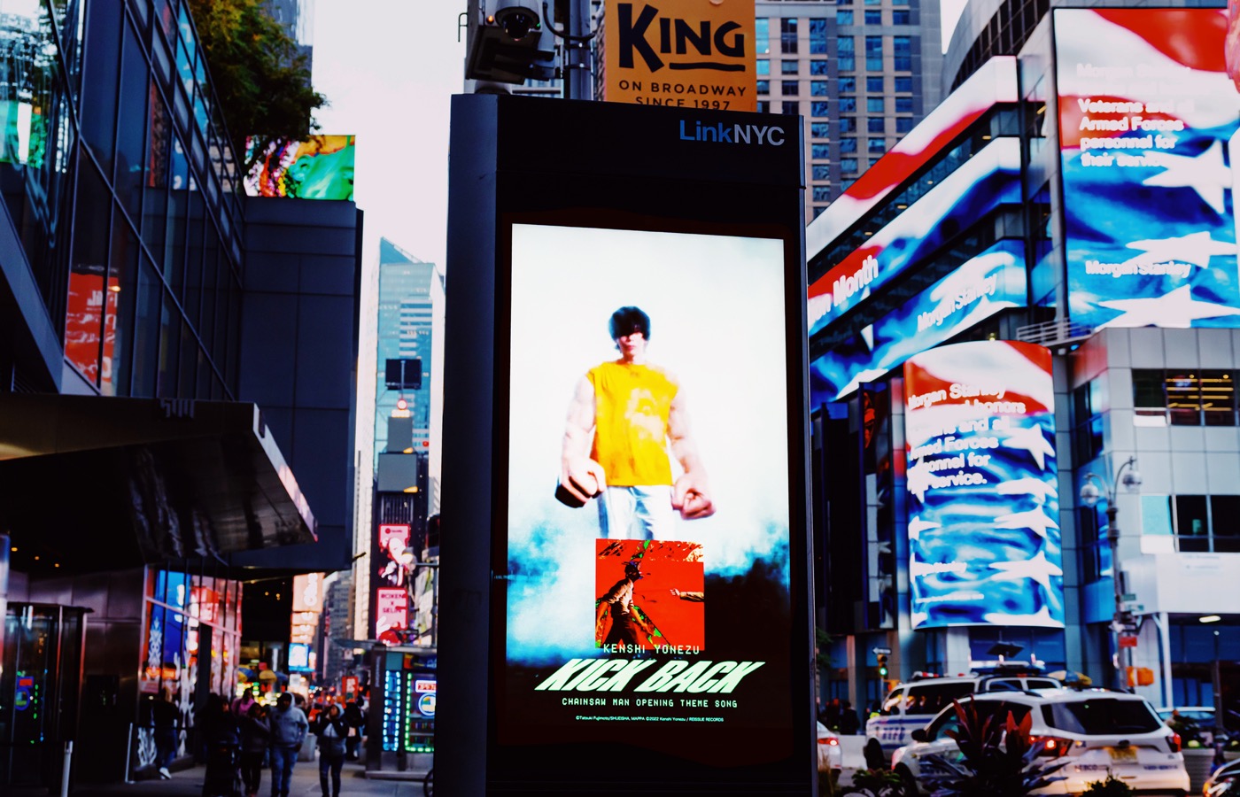 ニューヨーク・タイムズスクエアの広告は縦60メートルにも及ぶ巨大デジタルサイネージで、現地時間11月17日〜19日の間、米津玄師のアーティスト写真、「KICK BACK」ジャケット、『チェンソーマン』のビジュアルを使用した三面仕様。大きく「KENSHI YONEZU」の文字が映し出されている。