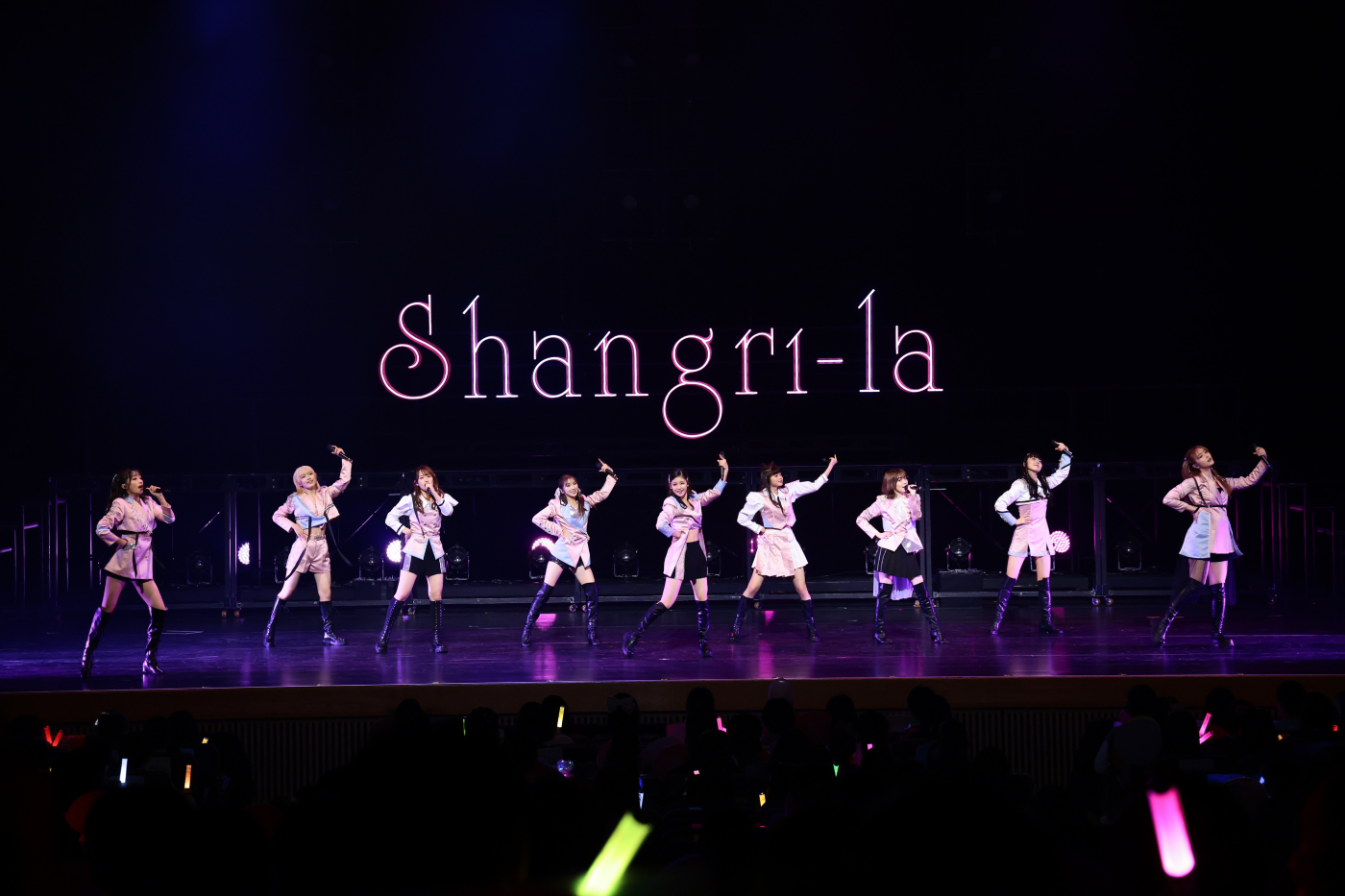 1曲目「Shangri-la」が始まると、今回のツアータイトルでもある「Shangri-la」のネオンサインがピンクに輝く。可愛さと色気を併せ持った衣装に、黒いロングブーツを身につけたメンバーの姿はとても華があるし、個性たっぷりに繰り広げられるパフォーマンスは離れた席から見ても迫力満点。