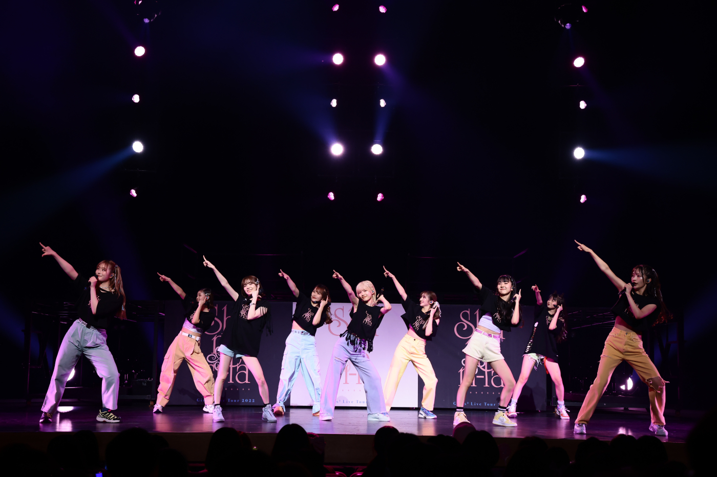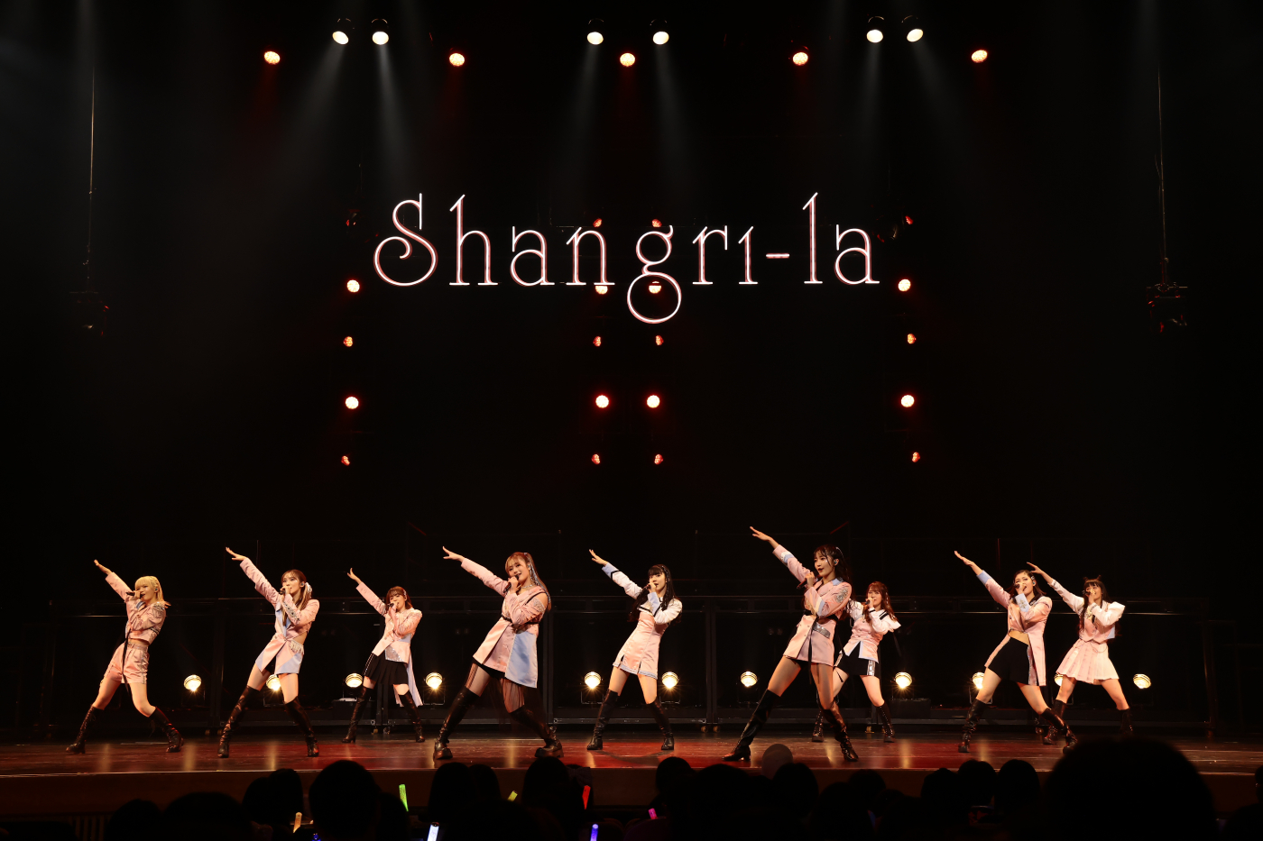「Shangri-la」のアーティスト写真でも着用している衣装にチェンジし、全員で「スキップ!」を披露した後は増田來亜と未渚美による「JEWEL GIRL」。ちょこんと階段に腰掛け、体を揺らしながら歌うふたりの姿がとても可愛い。