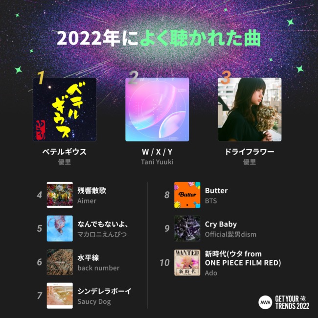 2022年によく聴かれた曲1位は優里の「ベテルギウス」。AWAが“自分だけの音楽史”を振り返る特設サイトを公開 - 画像一覧(2/5)