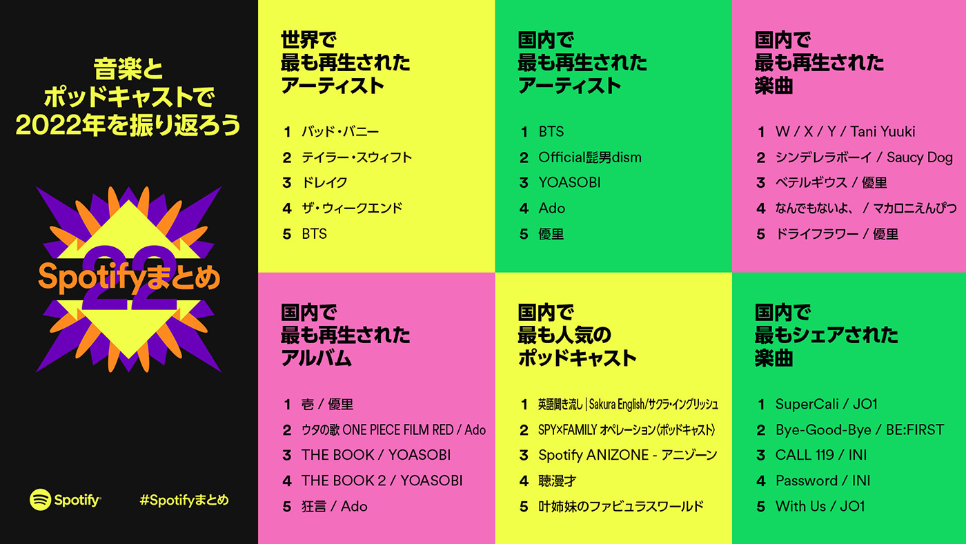 Spotifyが、音楽やポッドキャストなどの今年のリスニングデータから2022年を振り返る各種ランキングを発表。