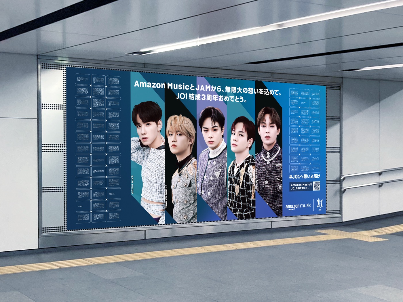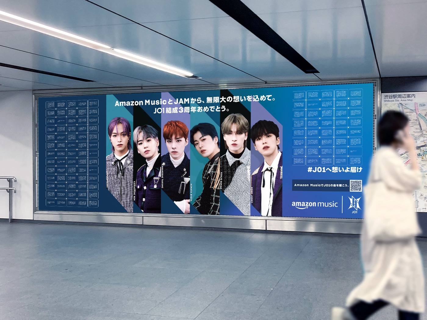 12月5日より掲出される屋外広告は、10月末から11月頭にかけて、Amazon Music JP公式Twitterにて募集されたもの。「#JO1へ想いよ届け」のハッシュタグと共に、ファンがJO1への熱い想いをツイート。寄せられたたくさんの熱いツイートから厳選されたメッセージが、屋外広告として掲載されている。