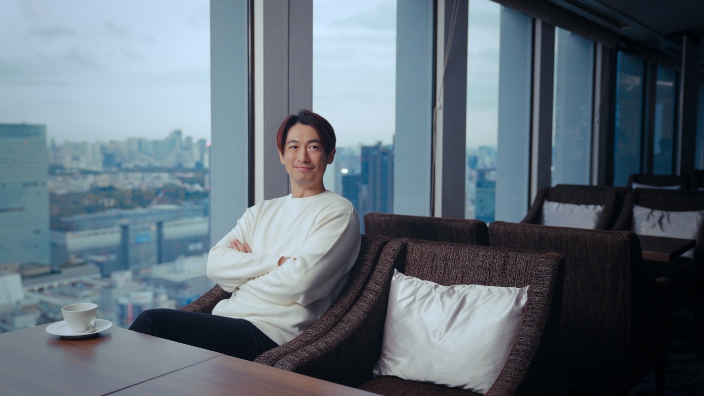 新宿の街が一望できるシックなスカイラウンジでは、「プライベートでも高いところに来て一息する時が多い」と外の景色を眺めながらご家族について語る場面も。限りなくオフに近い姿でリラックスしつつも、スタッフが家族について話す際は相手の目を見ながら真剣に話を聞き、アドバイスされる誠実な姿が印象的だった。
