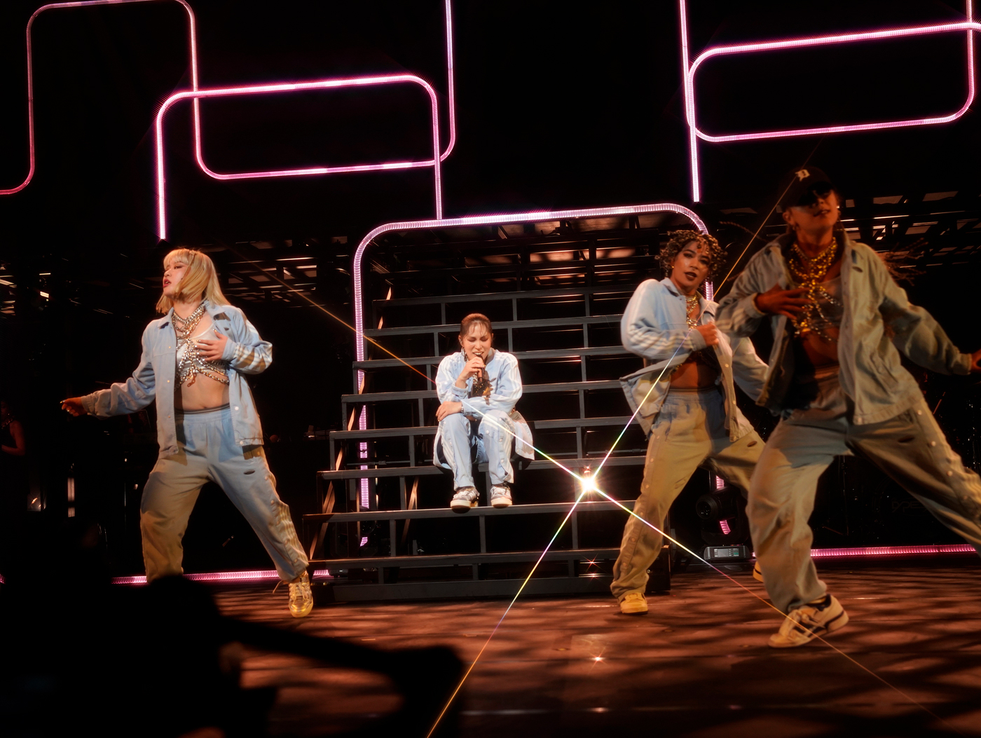 オープニングは、このツアーのために1,000人超の応募者から選ばれた女性ダンサー4人の強烈なパフォーマンス。ステージの上段にAIが姿を見せると、熱狂的な拍手で包まれた。1曲目は「Not So Different Remix」。“私たちは違わない”というメッセージを刻んだ楽曲が響き渡り、会場全体が高揚していく。楽曲の途中で女性ラッパーのAwichが登場。冒頭からスペシャルなコラボを目の当たりにした観客のテンションは早くも最高潮だ。