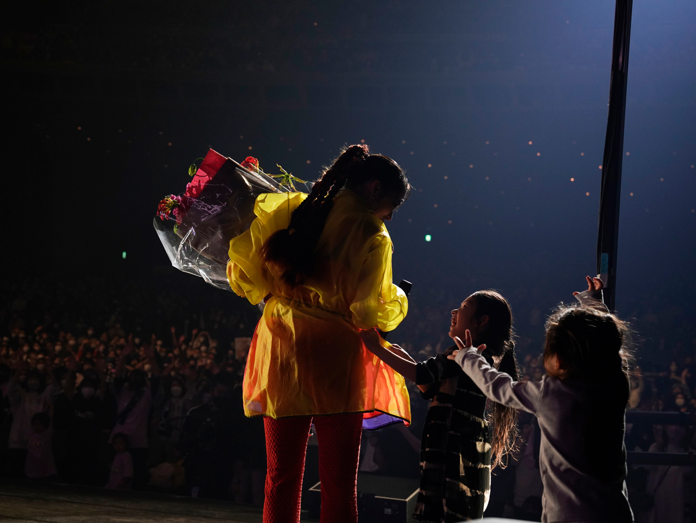 まずはピアノのソロ演奏に導かれた代表曲「Story」。“一人じゃないから / 私がキミを守るから”というフレーズを観客ひとりひとりに手渡すようなステージングによって、大きな感動を生み出した。続く「ママへ」「パパへ」では、客席の“ママ”“パパ”をステージに上げ、すぐそばで目を見ながら歌う演出も。ファンに対する温かい思いが伝わってくる場面だった。