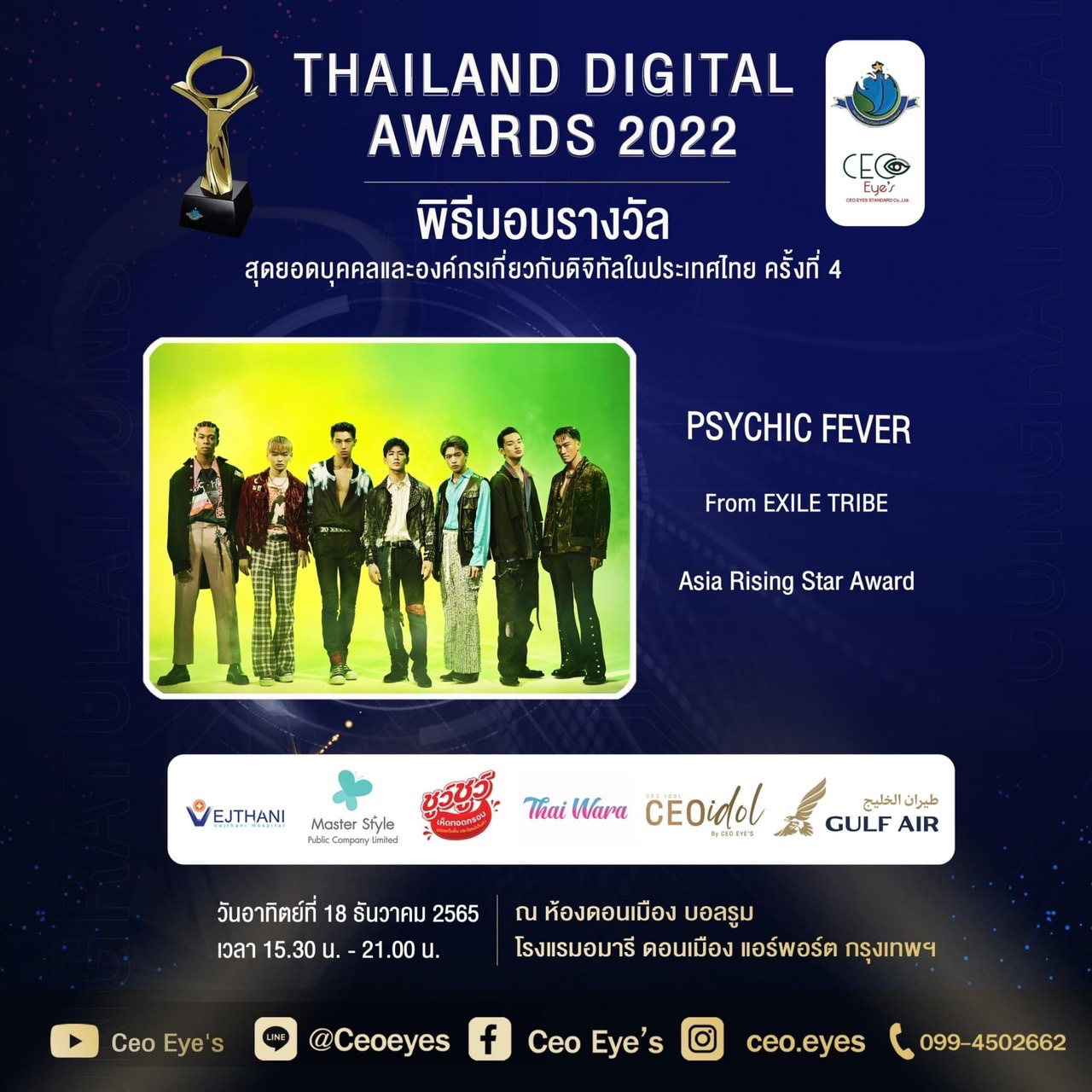 アジアで挑戦を続けるBALLISTIK BOYZ from EXILE TRIBEとPSYCHIC FEVER from EXILE TRIBEが12月18日にタイで開催された『THAILAND DIGITAL AWARD 2022』にて『Asia Rising Star AWARD』を受賞した。