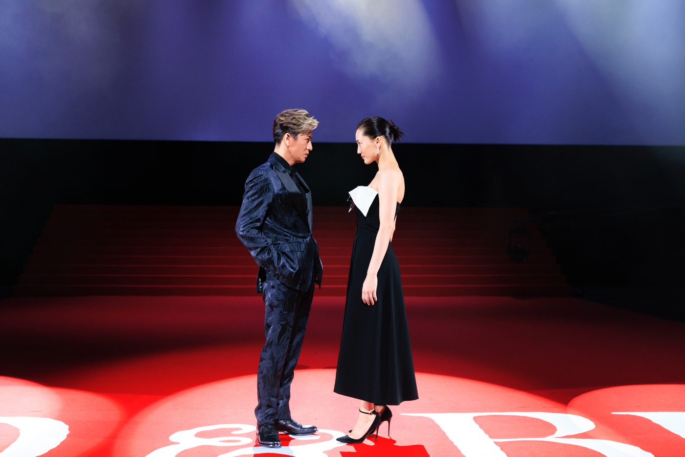 イベントがはじまると、暗闇に包まれた会場から、スポットライトに照らされた木村拓哉と綾瀬はるかがレッドカーペットの左右に登場。会場からの割れんばかりの拍手の中、レッドカーペットを歩くふたりが出会うと、まるで信長と濃姫のように熱い眼差しで睨み合い、手を取りながら宮沢氷魚、市川染五郎、音尾琢真、伊藤英明、中谷美紀、大友啓史監督が待ち構えるステージへ。総勢8名の超豪華キャスト、監督陣が勢揃いすると、さらに大きな拍手が巻き上がった。