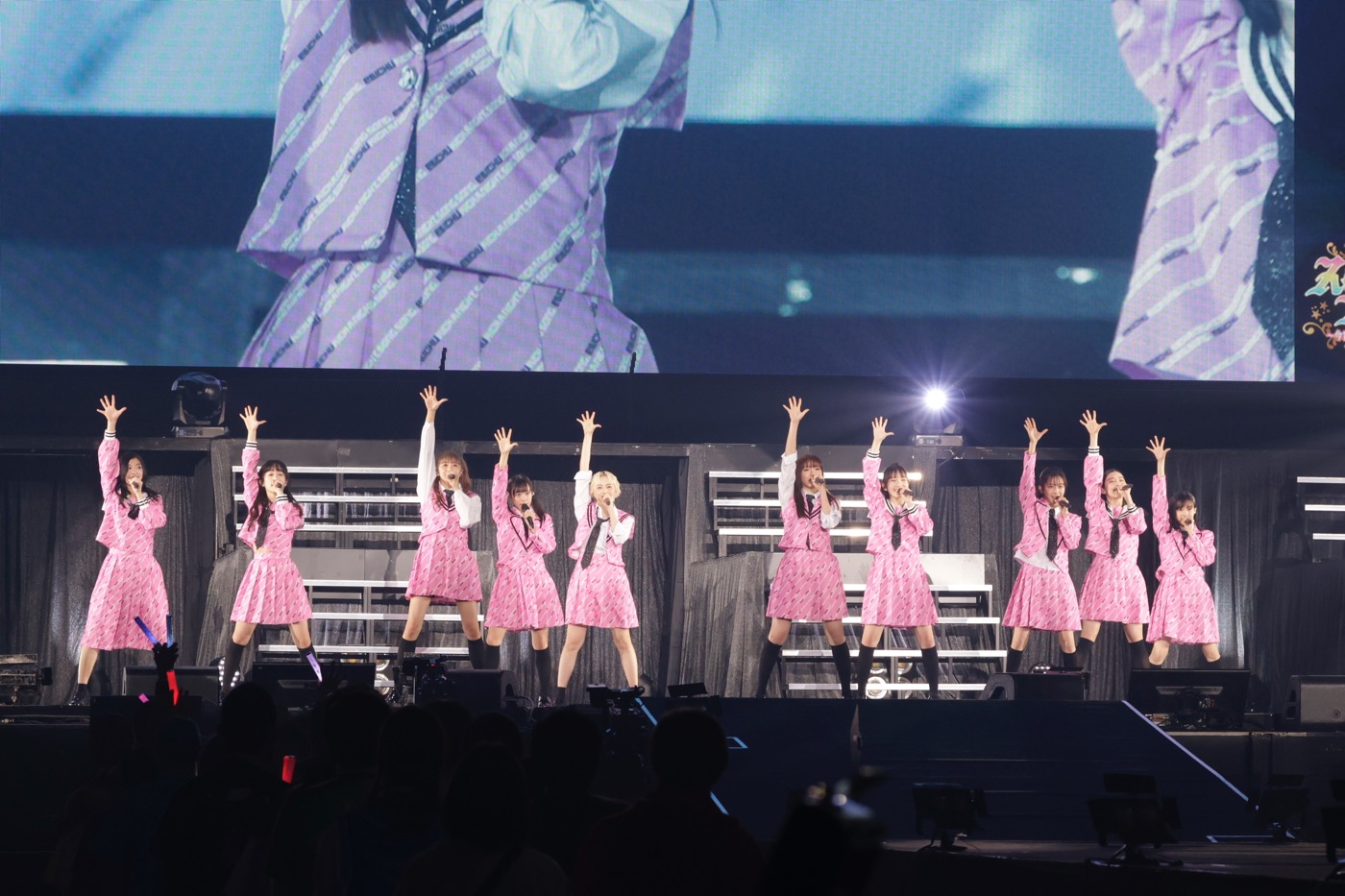 これまで獲得してきたポイントで優勝グループに目星が付いてきたかと思いきや、「けん玉チャレンジ」で意外にも成功者が続出。さらに、運次第の「1/10をつかめ!くじ引きチャレンジ」でTEAM SHACHIの秋本帆華が当たりを引いて2ポイントに浮上してくるなど、結果がわからなくなってきた。あとは、一気に3ポイントが入る最終企画「全力ダッシュチャレンジ」でグランプリが決定する展開に。その前に、超ときめき♡宣伝部のライブへ。パステルカラーにフリルのついたお姫様のような衣装が、「ラヴなのっ♡」や「わがままプリンセス」「トゥモロー最強説!!」でのキュートなダンスでヒラヒラと揺れる。トリを飾る播磨かなも、企画で着ていたピンクのジャージから着替えて、ブルーを基調としたワンピース姿で3B juniorの楽曲「勇気のシルエット」を感極まって涙を流しながらも、力強く歌い切った。その後、浪江女子発組合のメンバーも呼び込んで「ミライイロの花」を歌唱した後は、いよいよ最後の企画「全力ダッシュチャレンジ」へと突入。エンドステージからメインステージまで外周を使ってダッシュし、そのタイムを競う。ここで、私立恵比寿中学の風見和香が13秒台という圧倒的な速さを見せつけ、4ポイントでこれまで首位を走っていたいぎなり東北産と同点で1位に躍り出た。