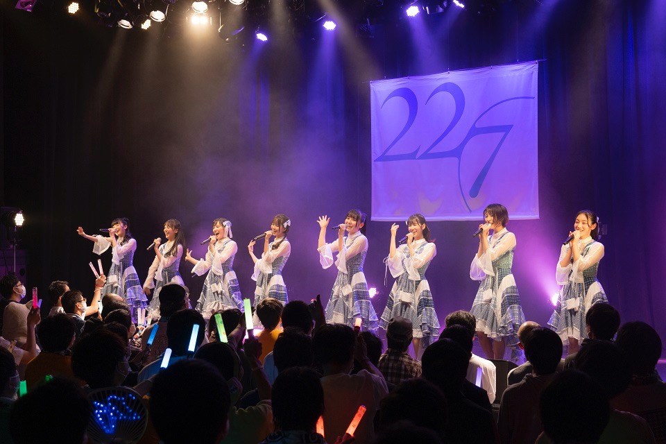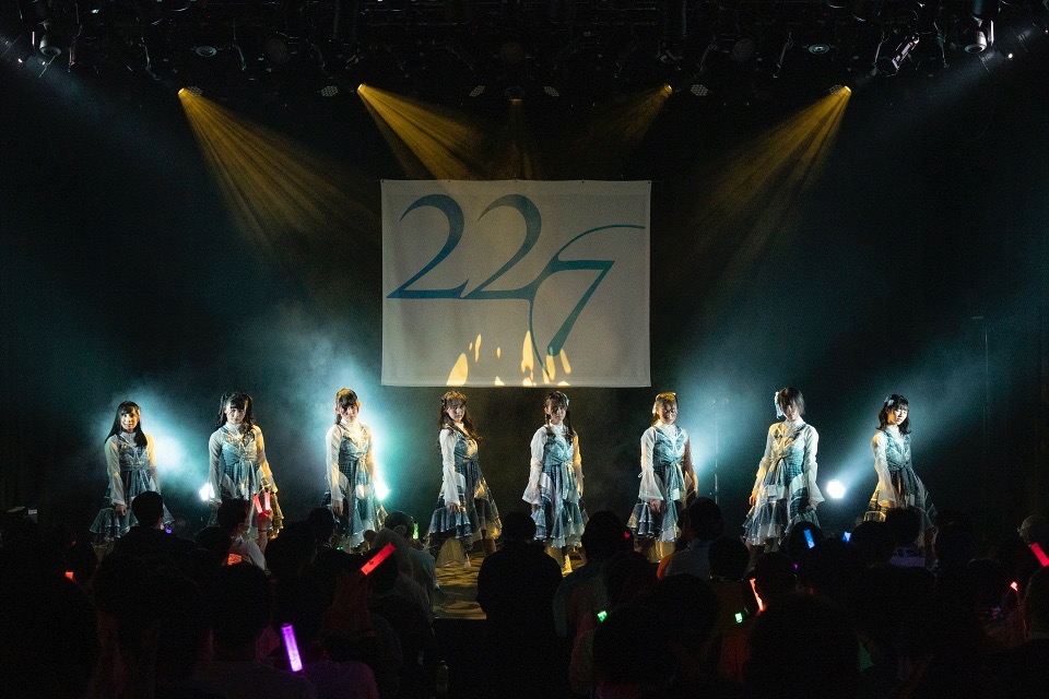 ライブの幕開けを知らせる「Overture」とともに、真っ暗なステージに姿を現した8人。1曲目は、22/7に加入して初めてリリースした、9thシングル表題曲「曇り空の向こうは晴れている」。今までは先輩メンバーの後ろ姿を見ながら披露してきたこの曲を、8人で完成しなければならないプレッシャーに打ち克つように最高の笑顔で乗り切った。