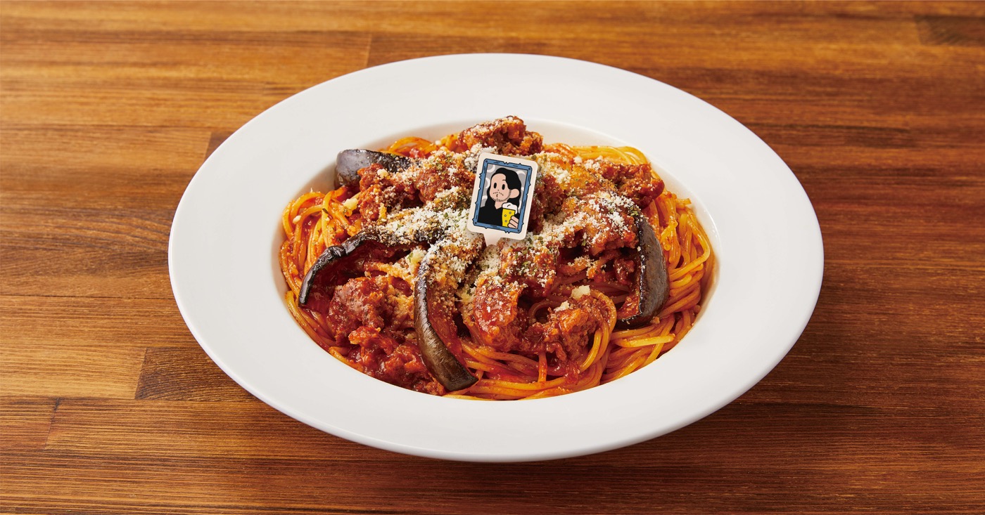 デミグラスソースとトマトソースを合わせたプロントオリジナルのソースと、ジューシーなハンバーグを丸ごと一個ほぐした「ゴロゴロお肉」、揚げ茄子を合わせた食べ応えのあるパスタ。肉好きのR-指定が大好きなボロネーゼを、肉感にこだわって仕上げた。パルメザンチーズとパセリパウダーをトッピングし、R-指定さんのイラストパスタピックを添えて提供。