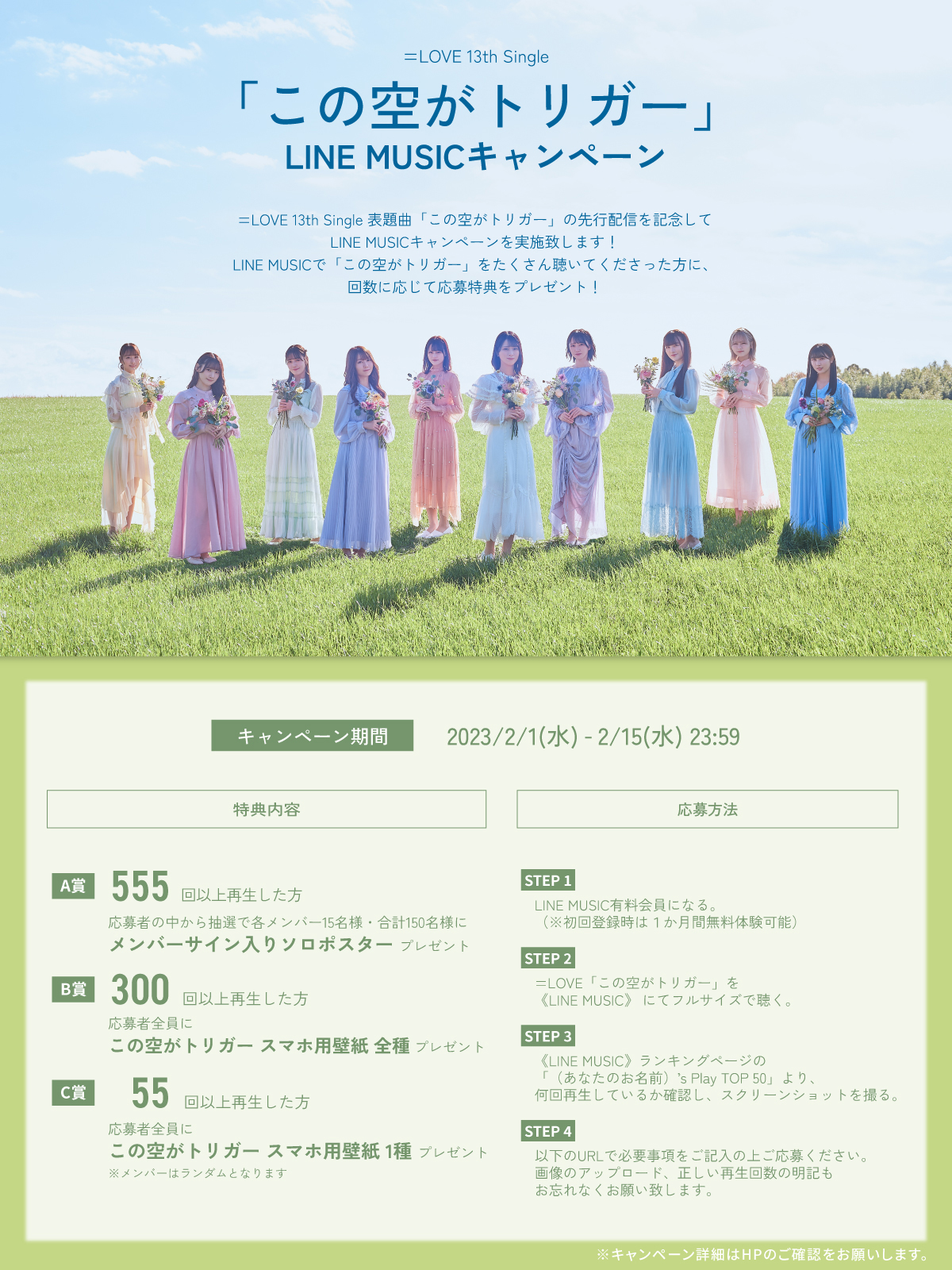 さらに1月29日に配信がスタートした新曲「この空がトリガー」の先行配信を記念して、LINEMUSICキャンペーンが開催。再生回数に応じて応募特典がプレゼントされる。詳細はオフィシャルサイトで。