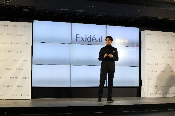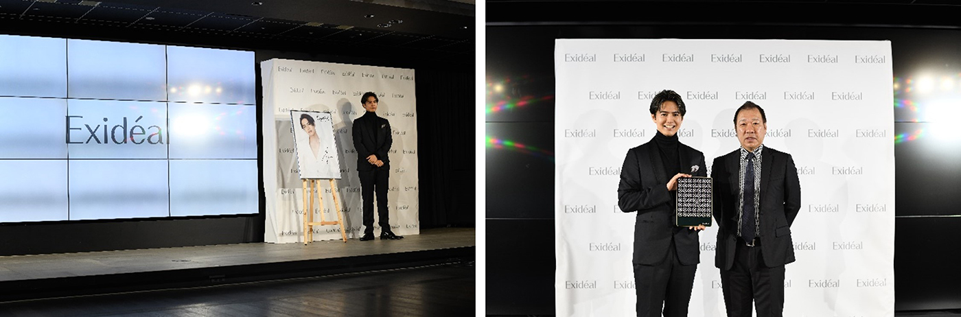 黒のスーツを身に纏い登場した片寄はExidealのイメージモデルとしての意気込みについて問われると「昨年よりイメージモデルを務めていますが、今後も外見はExidealを使用し、内面は精一杯自分なりに磨き続けていければと考えています」とコメント。
