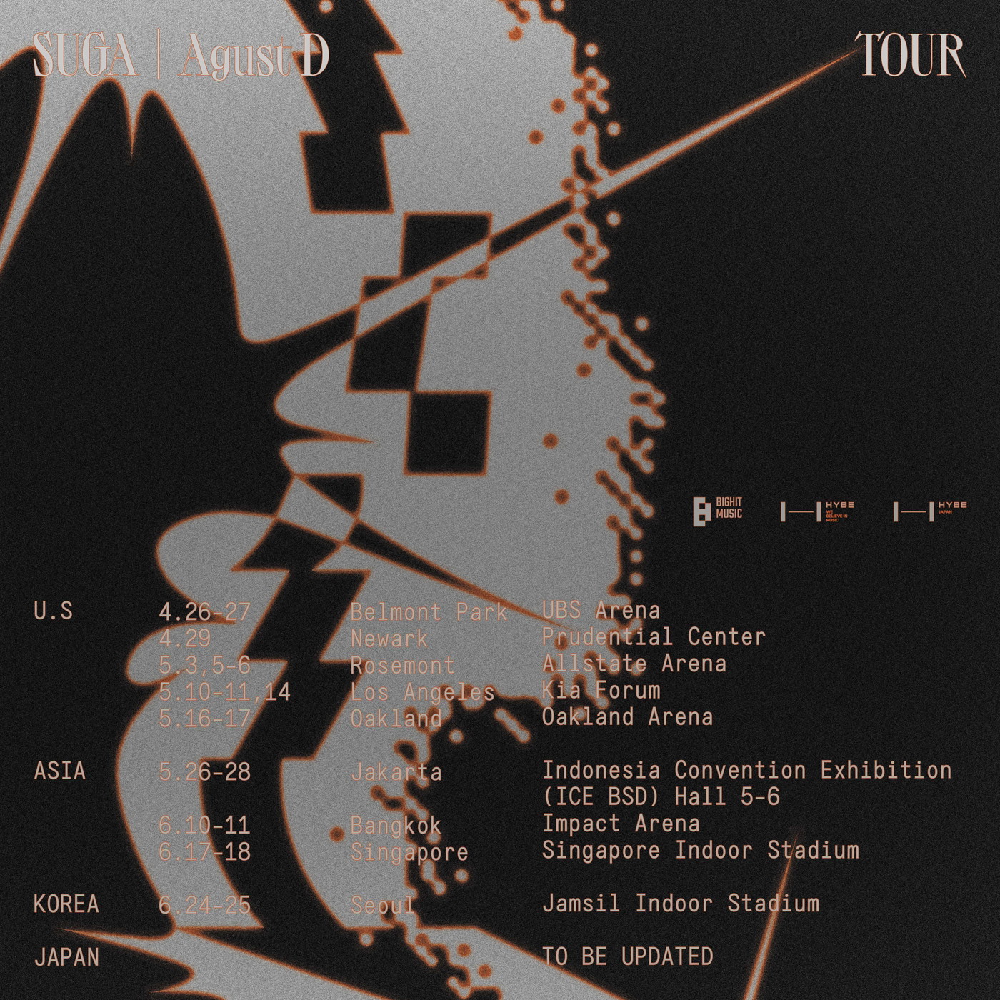 BTS・SUGAのソロ初となるワールドツアー開催が決定した。4月のアメリカを皮切りにインドネシア、タイ、シンガポール、韓国、日本など全世界都市での開催となる。日本公演の日程など詳細については、決定次第発表される。