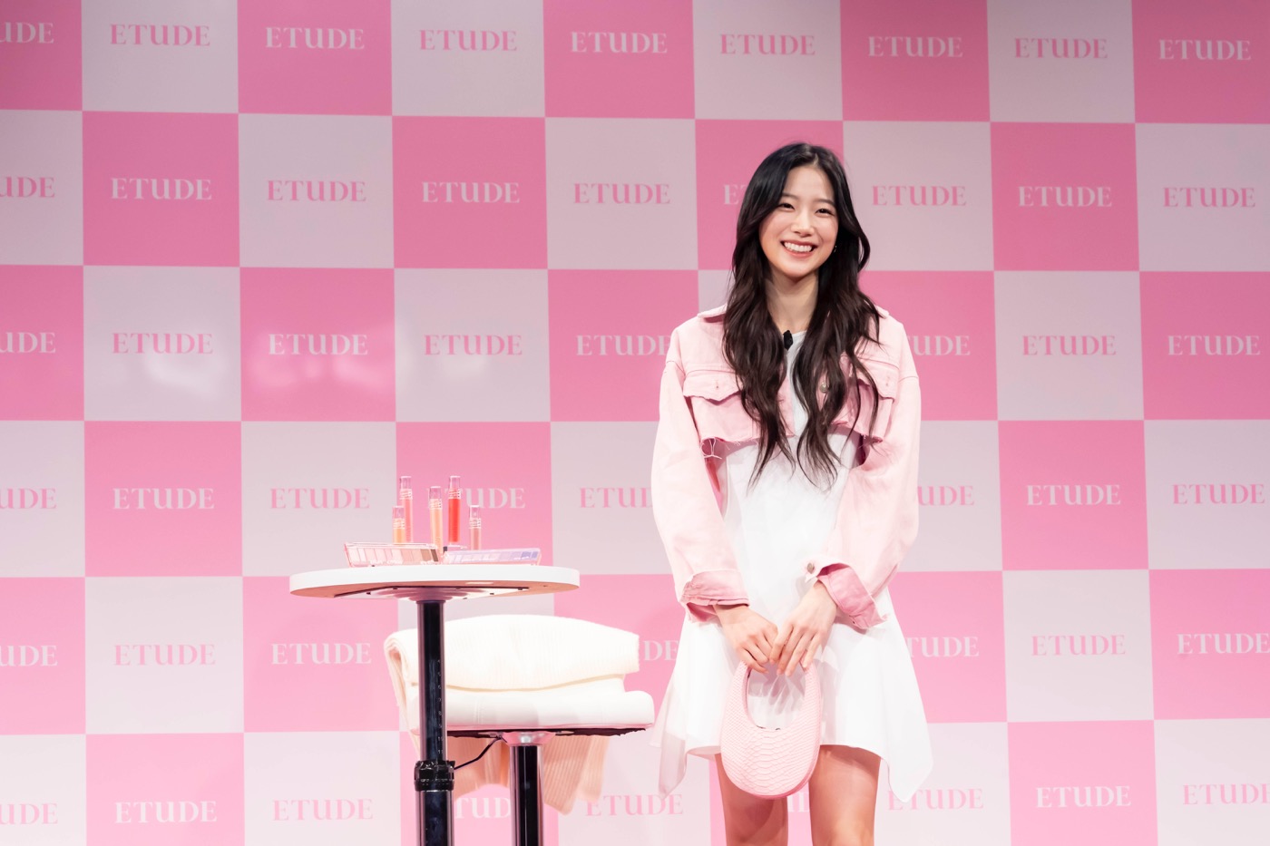 そして商品プレゼンテーションの後は、エチュードのブランドミューズに就任したLE SSERAFIM(ル セラフィム)のKAZUHAが登壇。真っ白なドレスに、差し色としてエチュードカラーであるピンク が入った衣装で登壇し、会場からは大きな拍手が沸き起こった。