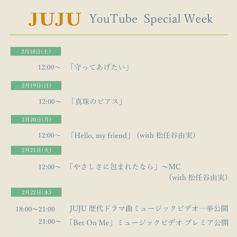 JUJUのオフィシャルYouTubeチャンネルで、ライブ映像やMVが連続公開される企画「JUJU YouTube Special Week」の開催が決定。
