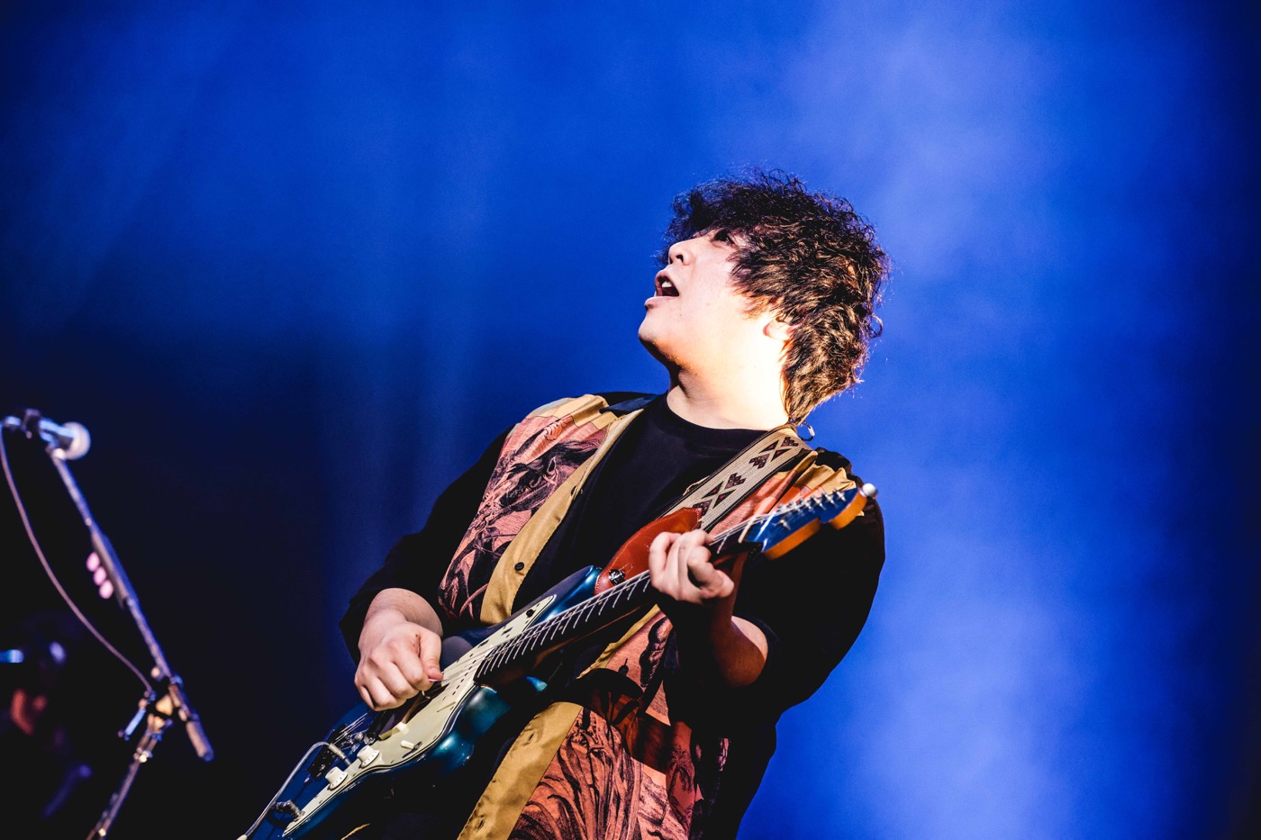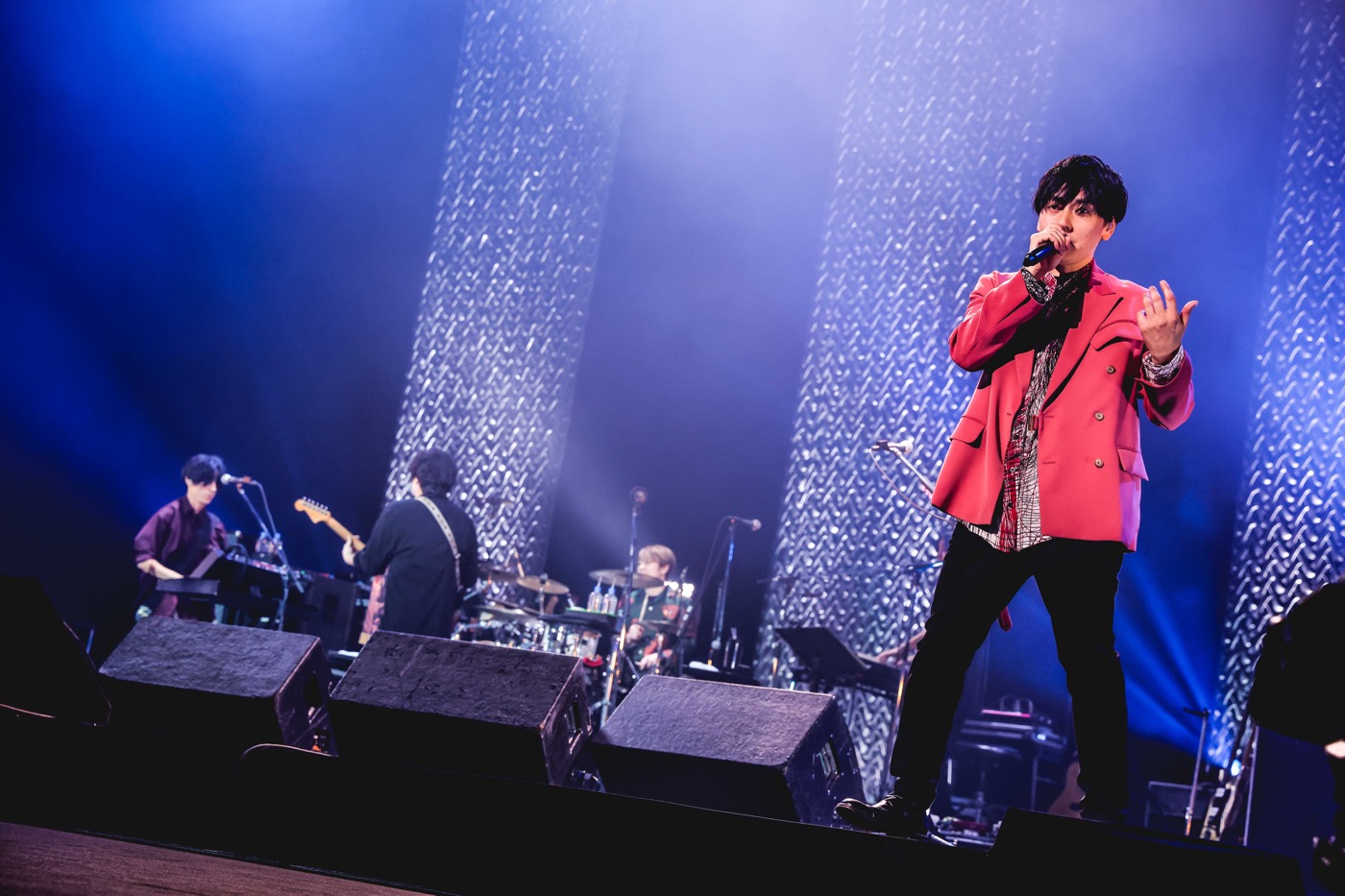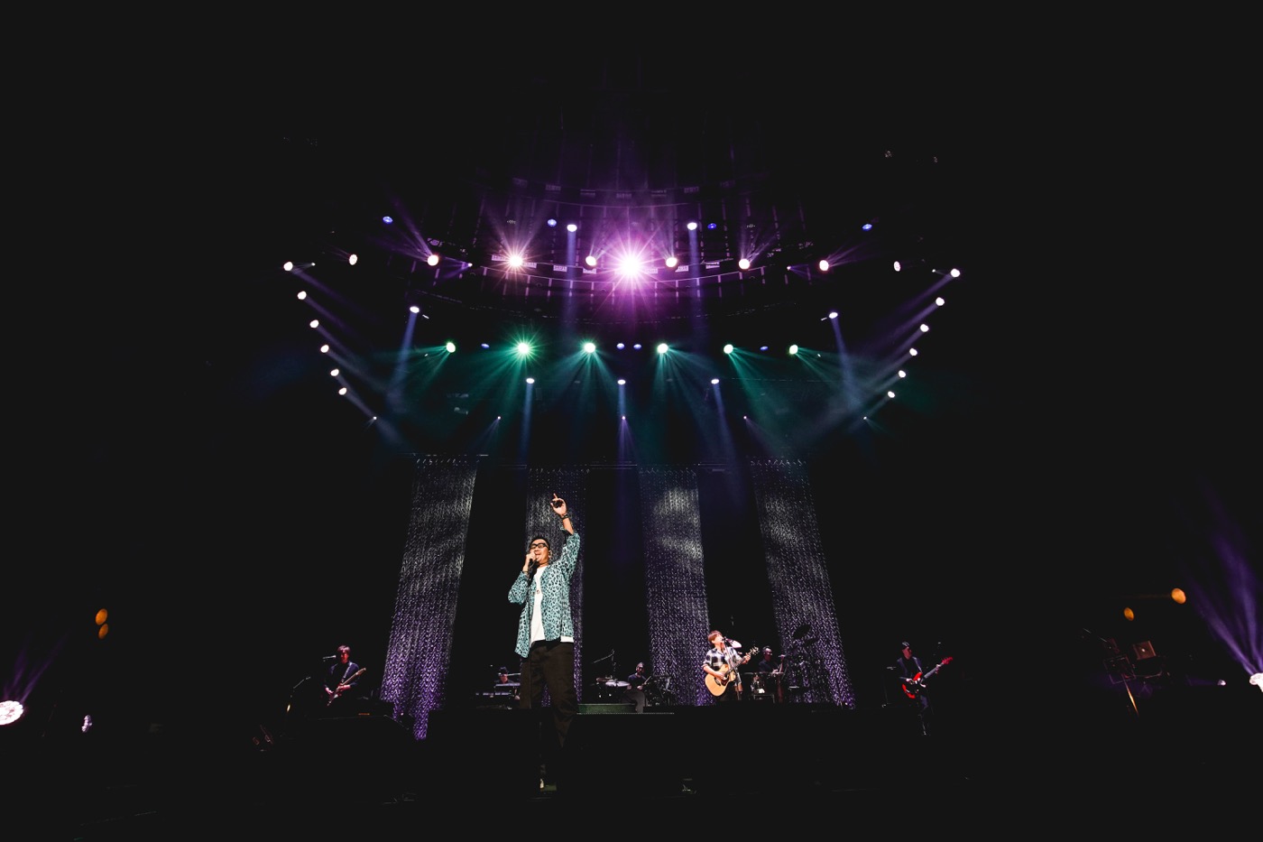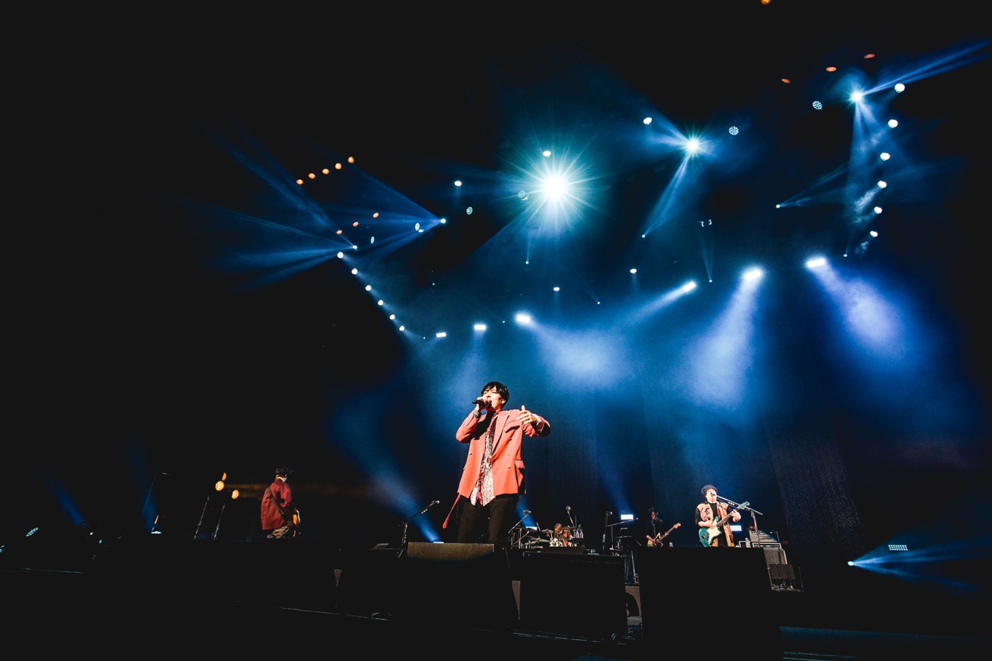 そして、満を持してのflumpoolのライブは、満場の手拍子に支えられた「Touch」からスタート。しなやかなボーカルを大阪城ホールいっぱいに響かせた山村が、「3年間、心の中で叫んでいた声を聞かせてくれ!」と続けたのは「星に願いを」。今日を迎えた喜びを長い拍手で伝える観客の姿に、「本当に来てくれてありがとう! 会いたかった。もう涙をこらえるので精いっぱいです」とは山村。続けて、「ホンマに最高の兄貴です。今日のライブも僕たちを刺激し、飛躍させてくれると思います。だからflumpoolも全力で、これまででいちばんいいライブをしようと思ってます!」と宣言し、メロウなミドルバラード「証」では、巨大な空間を鮮やかに彩る照明もろとも世界観を構築。「今日来てくれた皆さん一人ひとりがいなかったら、僕たちの夢はかないませんでした」と感謝を述べた後も、「どんな未来にも愛はある」~「その次に」と、flumpoolが15年かけて積み上げた切なき楽曲群に心地良く引きずり込んでいく。