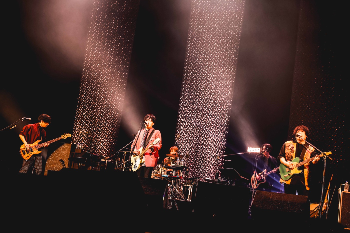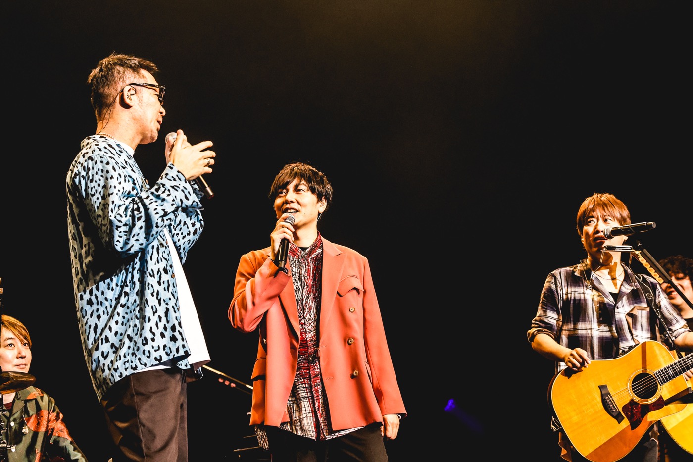 その後も、さすがのMCで息をつく暇もないほど場を沸かせ、小渕が「今まで我慢した3年分の声を、思う存分出せる曲をやります。25年前から路上ライブで歌っていた曲を聴いてください!」と語り始まったのは、「ストリートのテーマ」。バッチリ決まった久々のコール&レスポンスには、コブクロのふたりも「最高だ! やっとこの日が来た」と、思わず感激の表情に。一転、切々と歌い上げた感動のバラード「未来」、力強い旋律をバンドと一丸となって放った「DOOR」と立て続け、3月1日にシングルリリースとなる最新曲、TVドラマ『リエゾン-こどものこころ診療所-』の主題歌「エンベロープ」も初披露するなど、壮大なスケールで会場を包み込んでいく。