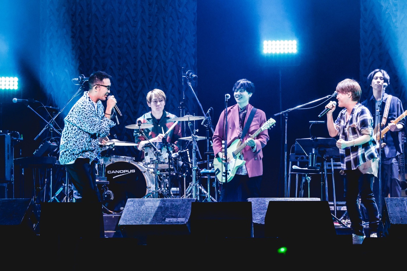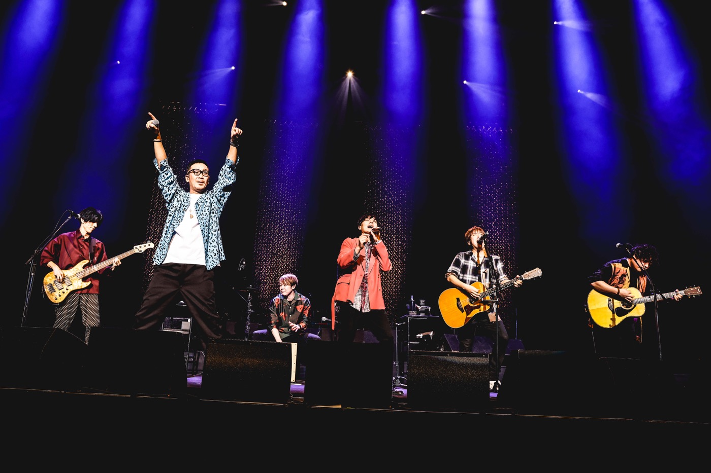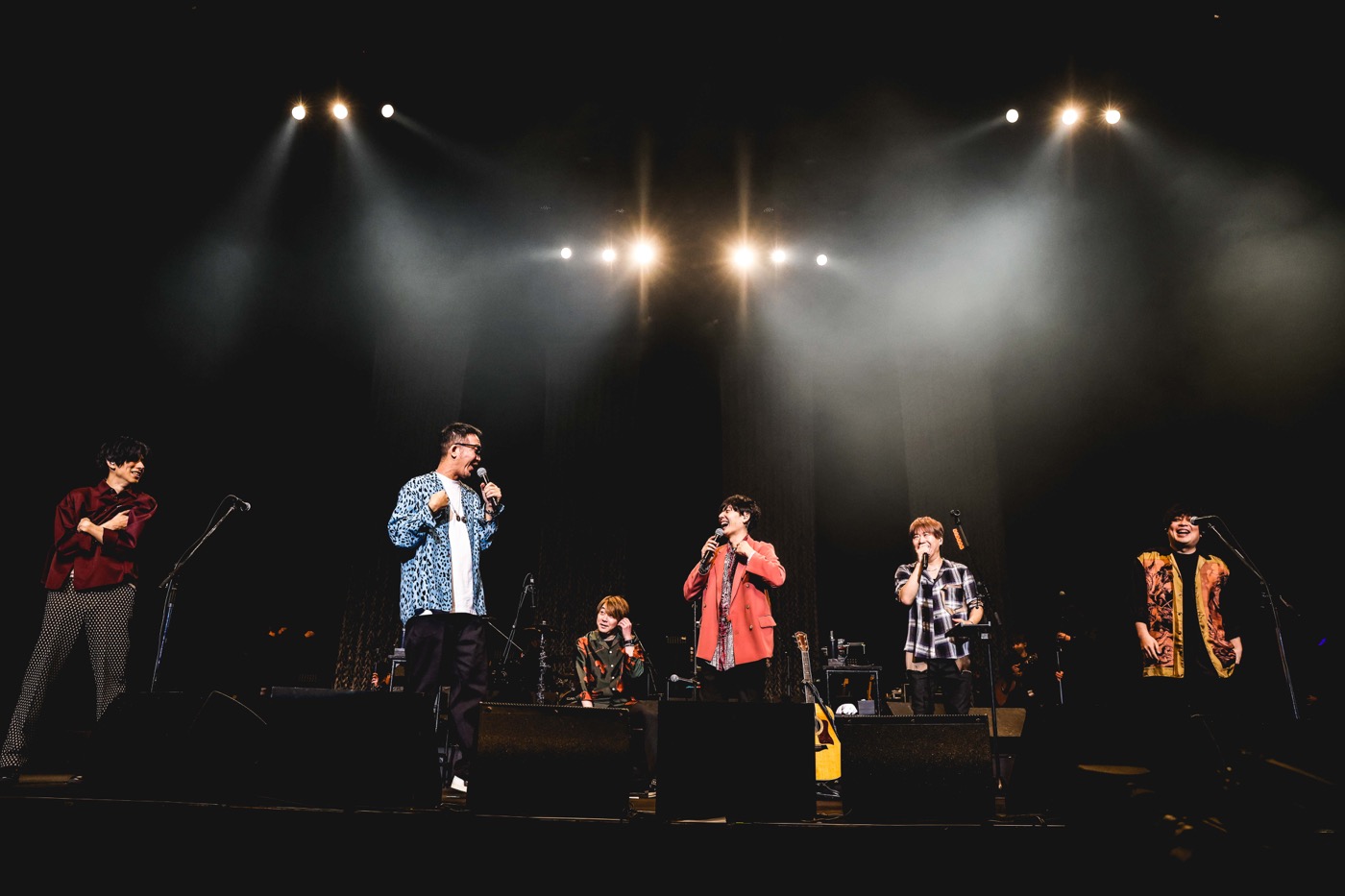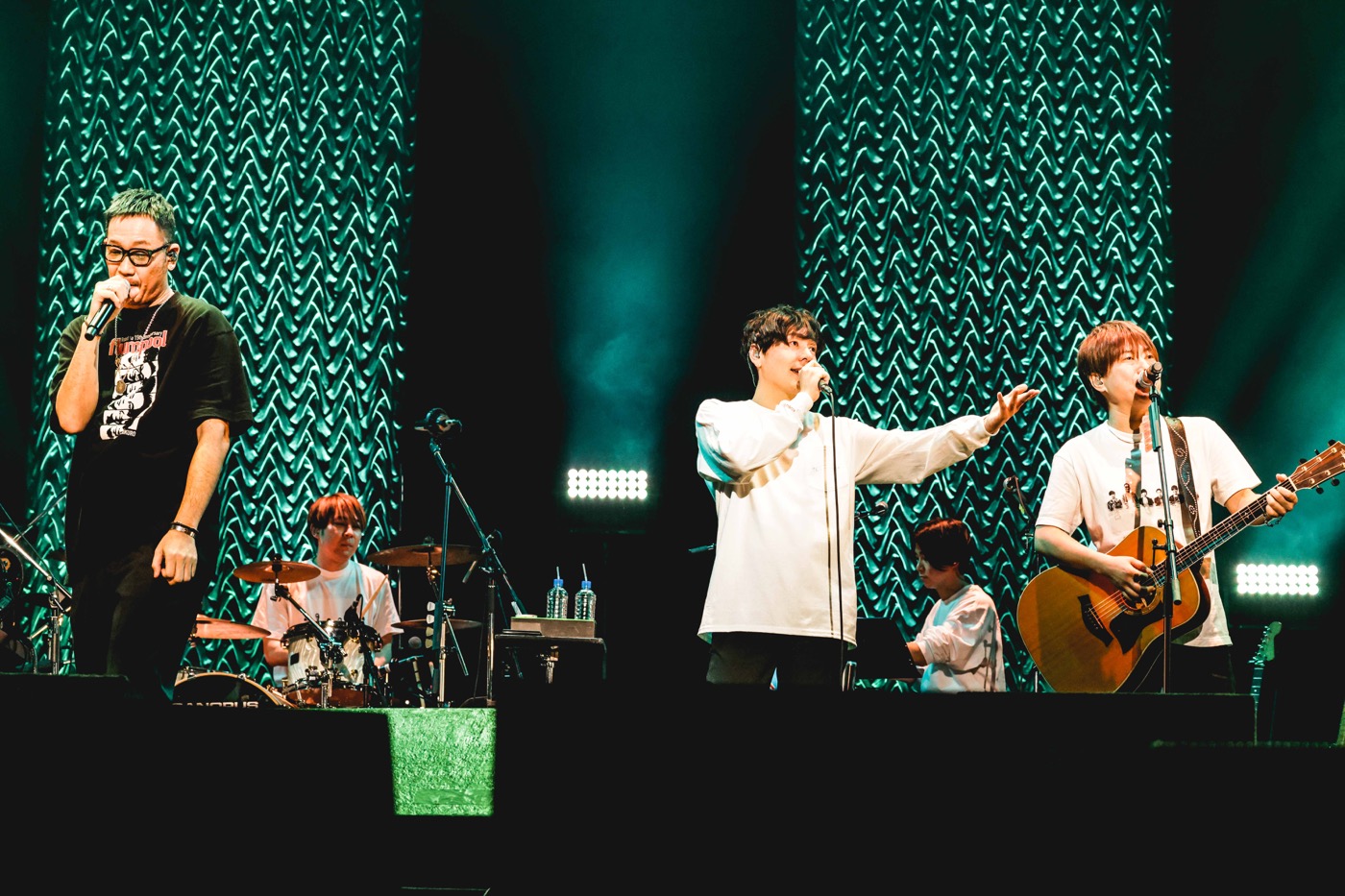 間奏の和太鼓の乱れ打ちでも魅せた2025年の大阪・関西万博オフィシャルテーマソング「この地球(ほし)の続きを」の後は、「せっかくなのでギターだけで、ストリートライブみたいにやってみようと思います!」と小渕が告げ、flumpoolのメンバーも合流。「むちゃくちゃ出にくいし! 面白過ぎます」と山村が嘆くのも納得のコブクロのトークモンスターぶりには終始翻弄されつつも(笑)、コブクロの代表曲「轍-わだち-」を何とも贅沢な6人編成で届けると、まだライブの中盤ながらクライマックスのごとき熱量で大合唱が巻き起こる。両者とも楽しくて仕方がないという様相で、当時flumpoolがストリートでよくカバーしていたというコブクロの「Bye Bye Oh! Dear My Lover」も和気あいあいと演奏した、スペシャルなコラボとなった。
