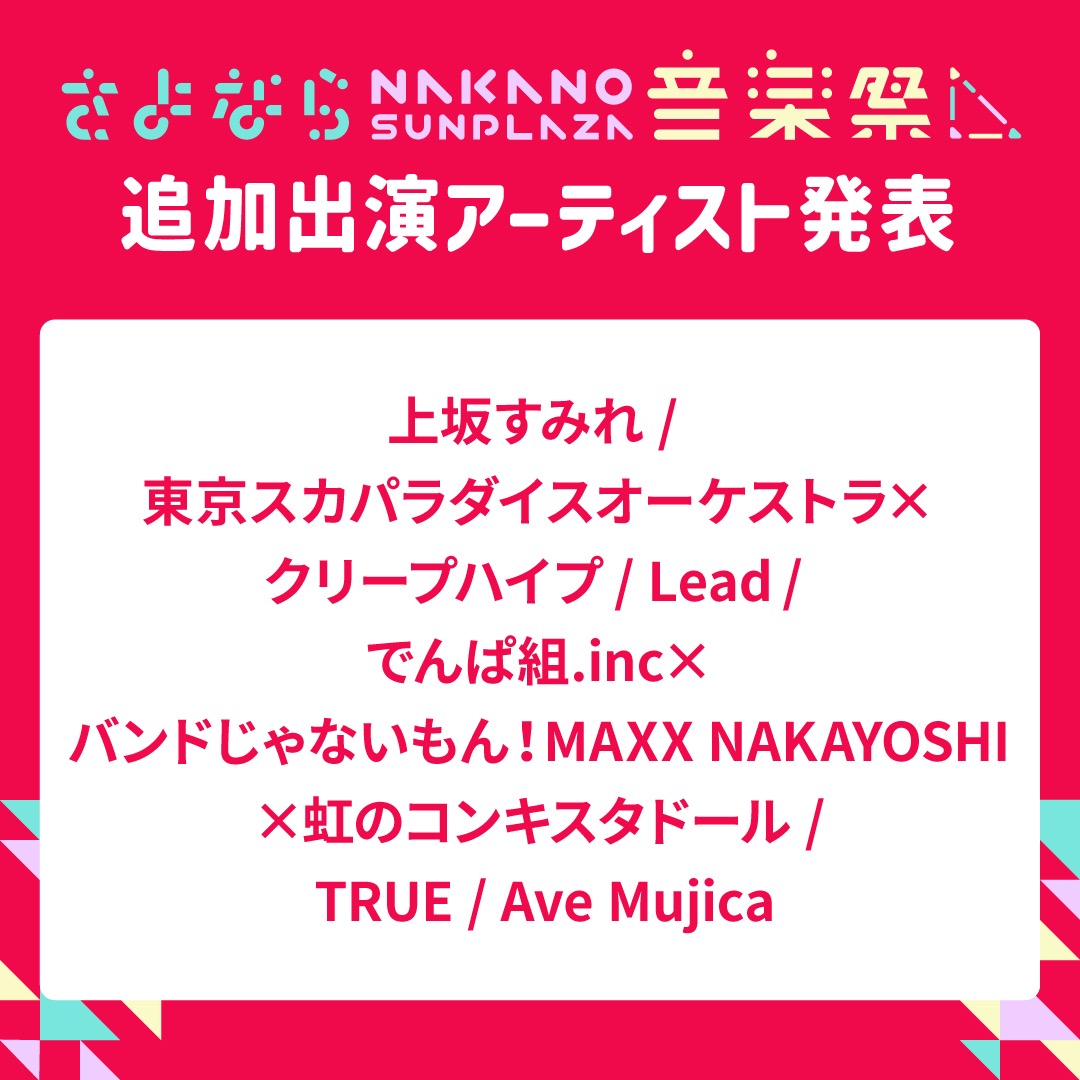 東京・中野サンプラザにて、5月1日から7月2日までの2ヵ月に開催される音楽祭『さよなら中野サンプラザ音楽祭』の出演者第2弾が発表された。