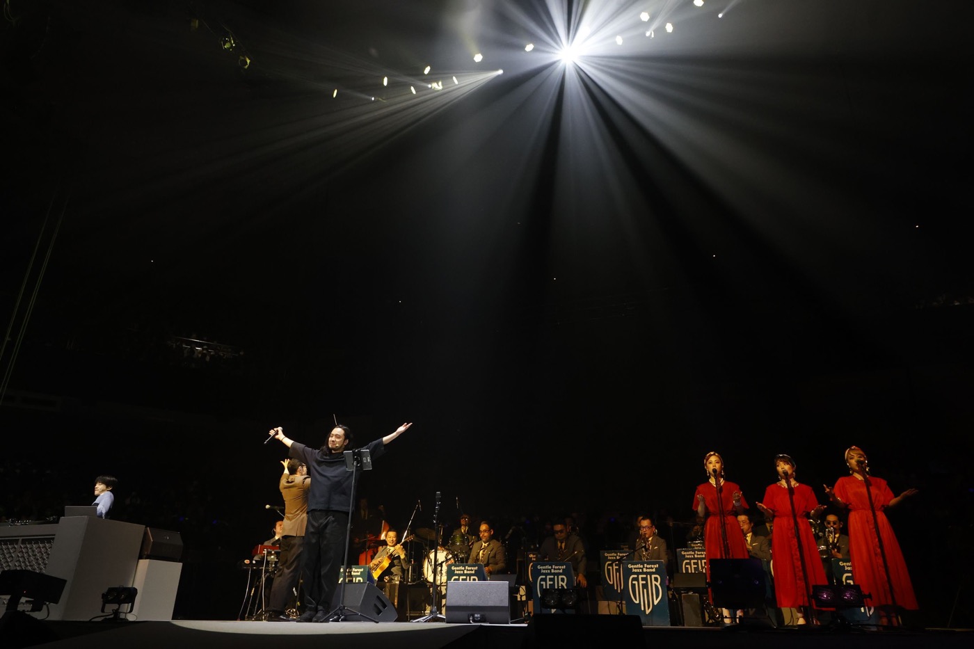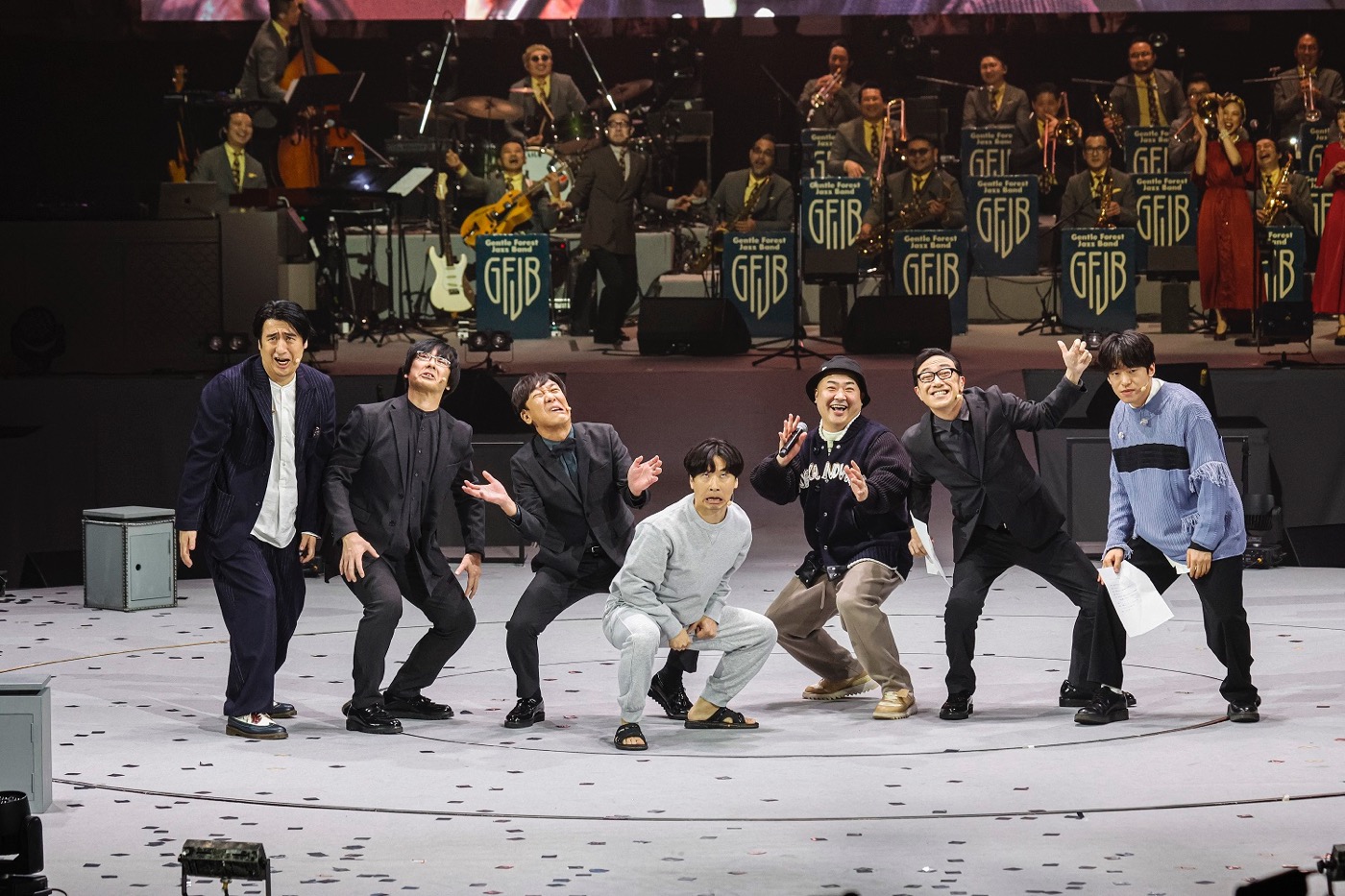 そして、Creepy Nutsはコントのメッセージ性が鋭いリリックとリンクした「サントラ」「のびしろ」などの楽曲も熱演。GENTLE FOREST JAZZ BANDの煌びやかな演奏をバックに、圧倒的なパフォーマンスで観客の目を惹きつけ、自然と手が波のように振れていく。そのほか、なかなかR-指定扮する芽が出ないラッパー、“野上”がディスりを武器に駆け上がりZIGOKUとしてブレイクするも自分を見失う『ラップ歌劇』から、女優を辞めた信子、ラブちゃん、その場にいたこじらせた大人が冒頭のコントの「大人ってそんなもんなの!」と大きな伏線回収をする『やめる』という、すべての点が繋がり線となる展開に、笑いと感心、感動を覚えた先で、4日目は若林、5日目は春日が登場。