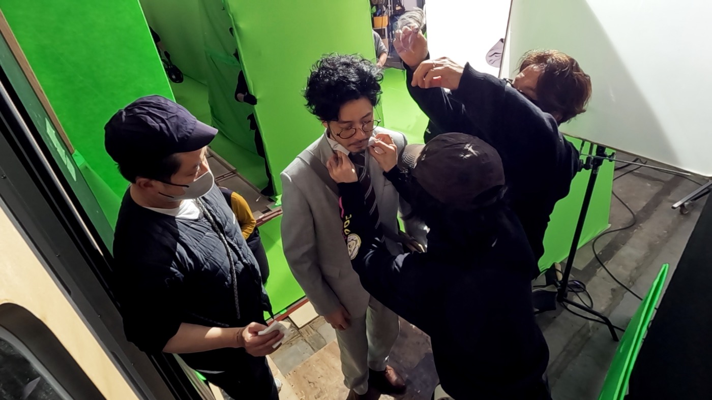 メイクから衣装までそっくり似せた48名の“オダギリ役”と“山崎役”のキャストを前に、驚きながらスタジオ入りしたふたり。一つひとつ表情やセリフのニュアンスについて、スタッフと細やかな部分まで打ち合わせるオダギリの真剣な表情からは、心動かす動画に仕上げたいという熱意を感じられた。