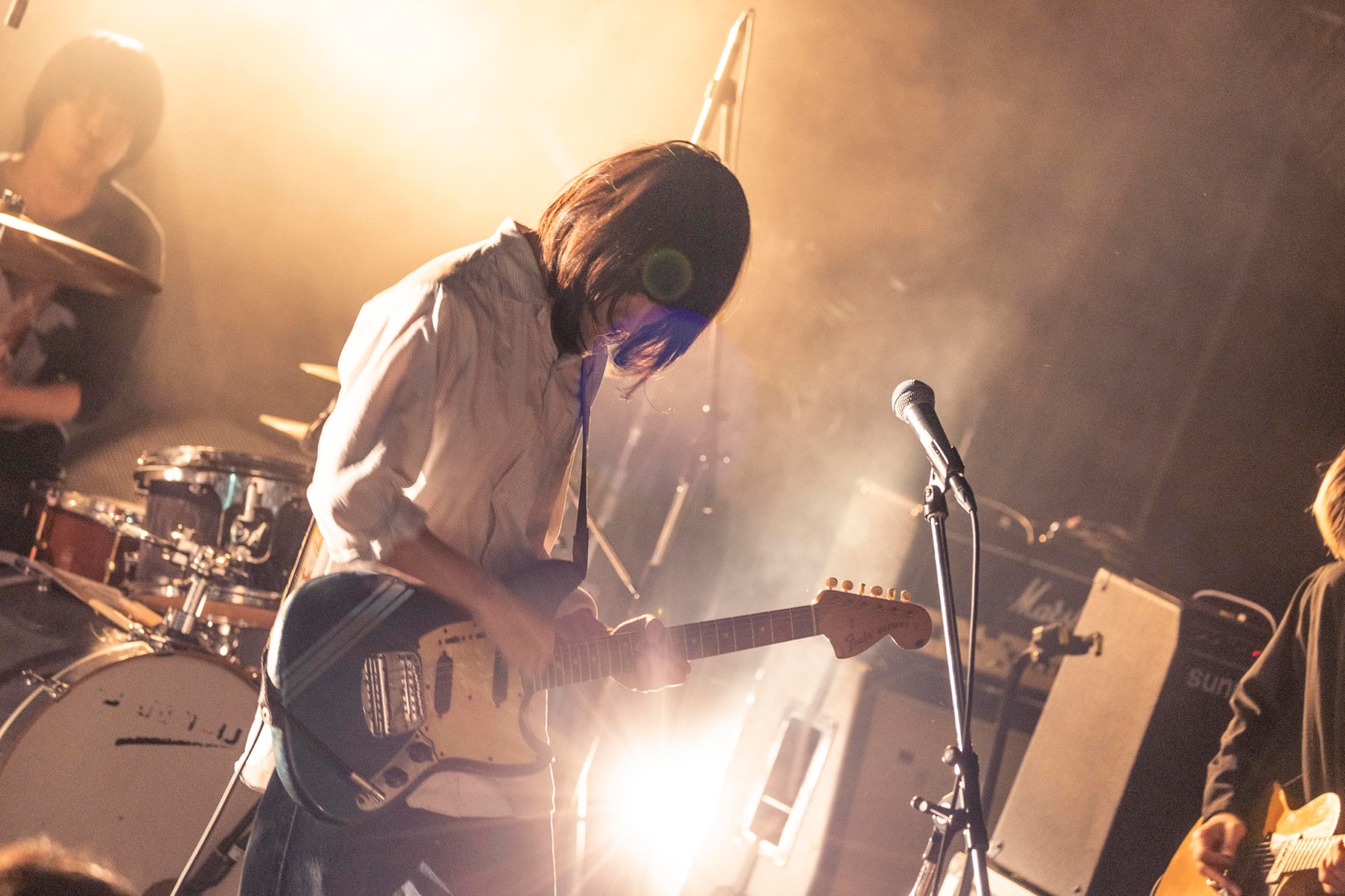 この日坂井はややハスキーなボーカルでそれもまた一興とでもいうか、個人的には青白い熱量を持った曲にさらなる陰影を加えていく味が出ていたり、ヒリヒリとした感覚もあっていいなという瞬間も多かったが、「今日はこんな声だけど、めちゃくちゃいいライブをするので」と言ってサウンドの馬力をあげていく。その真骨頂と言えたのが、「Sing for you」に続いた、「Goodbye sea」だろう。フィードバックノイズからザクザクとしたギターリフでキャッチーに観客を曲に引っ張り込んだかと思いきや、曲が進むにつれて甘美なシューゲイザーサウンドで痺れさせ、またエクスペリメンタルに曲が広がっていく。“バンド”ならではの呼吸感とドラマ性、導火線に火をつけその日その場限りの間合いや空気感でジリジリとクライマックスへと上り詰めていく緊張感に会場が息を飲むのがわかる。