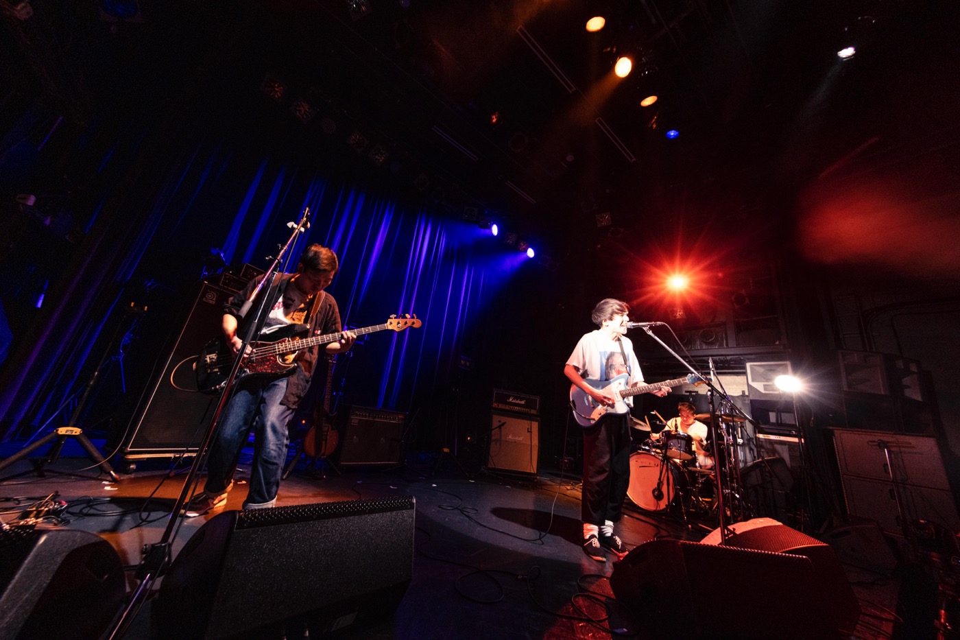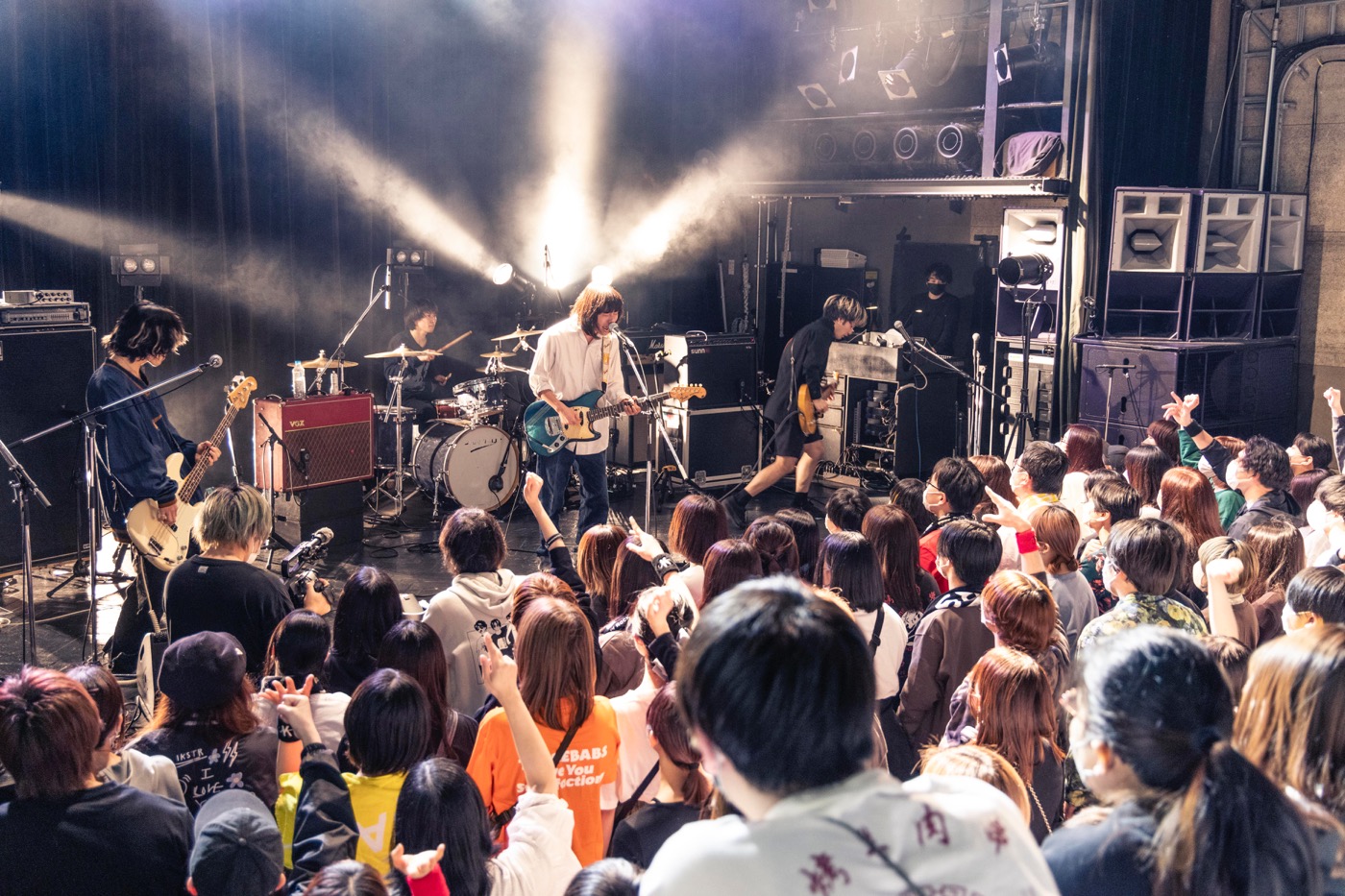 1曲目は2月にリリースしたデジタルシングル「Neighbor」。ギターのリフレインが印象的で、骨太なUKロックをルーツに感じさせるギターオリエンテッドなサウンドと歌心のあるドラマティックなメロディが冴える。続けざまに「Hesitate」で加速するアンサンブルに揺られているうちに、ギターふたりの音が密度高く絡み合い、ベースとどっしりとしたドラムが織りなす重厚なビートが観客を大きく飲み込んでいく。一気に深みを帯びていったウォールオブサウンドと強力なストロボライトとが相まって、酩酊感が襲う。ロックバンドとしての引力のあるステージだ。